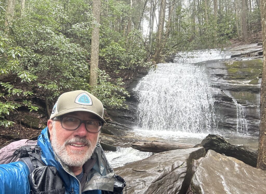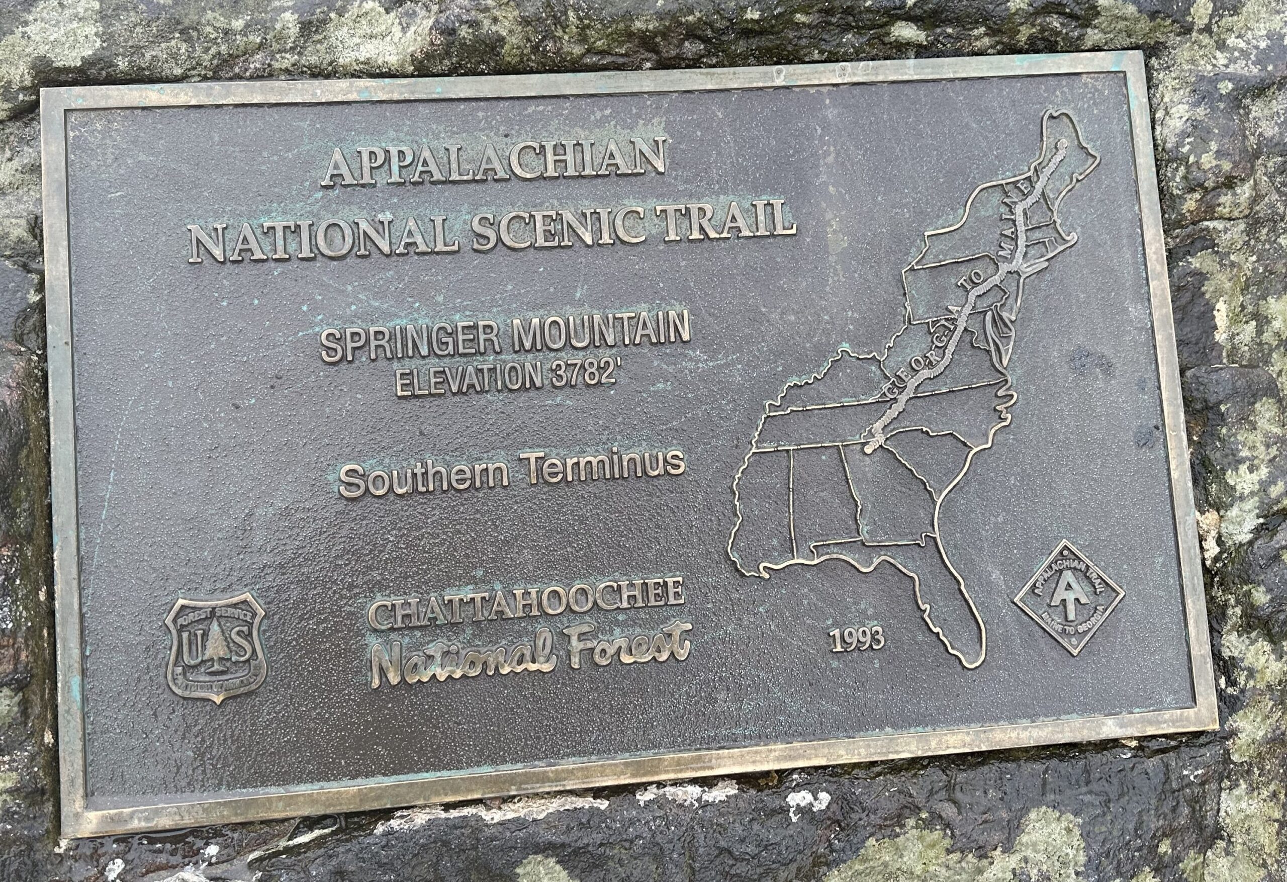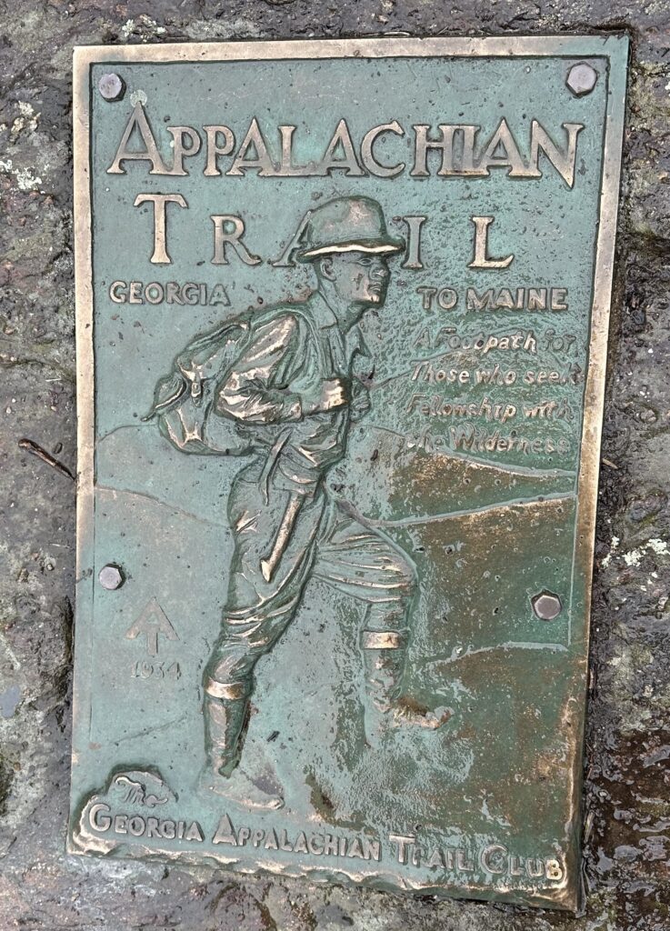 When I went to bed last night there was to be no rain until Saturday. Up early this morning and checked the weather – drizzling rain until 8am. Just light enough at 7:30am so took off on the approach trail thinking the rain was about to stop. Four hours later I reached the AT start at Springer Mountain and it’s still raining, even harder. I nearly missed the AT southern terminus monument in the mist and only noticed it two feet away while letting a couple of hikers pass by. My glasses were pretty fogged up.