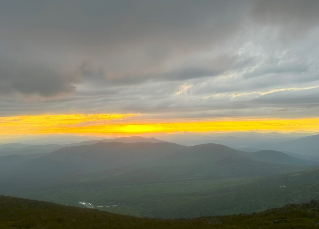 Got checked into the Lakes of the Clouds Hut, the largest (capacity of 90) of the 8 AMC huts in the Whites. This hut gets heavy traffic from hikers doing the hut traverse, the Presidential traverse, short walks from the Cog Railway or the Mt Washington Auto Road. Shortly after arriving, the rains came in full force, sending waterfalls off the hut roof. Grabbed a bottom bunk in a small room that held 15 hikers in floor to ceiling stacked bunks. Spent most of the afternoon drinking hot chocolate in the dining hall and chatting with Lance and Jennifer from Charlotte. I met and hiked with on the trail today. Partial clearing late in the afternoon offered snippets of Mt Washington summit views and an absolutely gorgeous sunset.