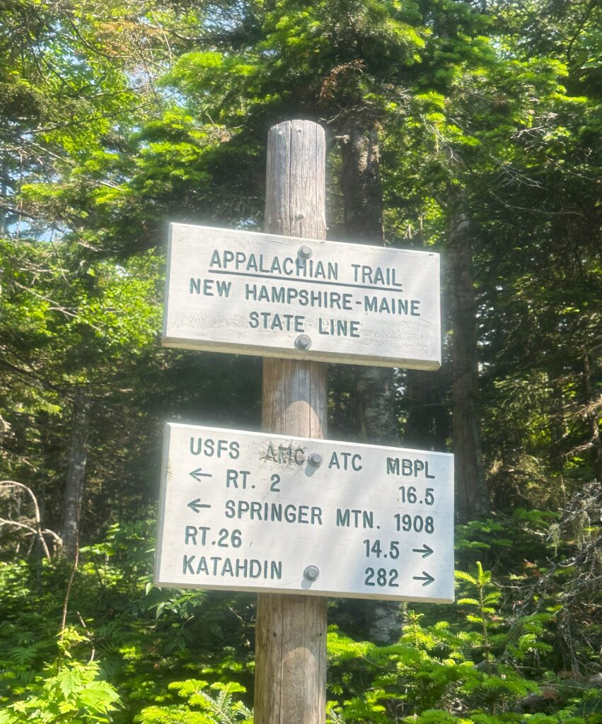 I almost immediately started climbing this morning to the summit of Mt Success, the southernmost peak in the Mahoosuc Range. Walked across the summit ridge on glacially smooth granite slabs, also having to cross several alpine bogs on sometimes submerged and very slippery boardwalks. I tested a few bogs with my poles – two to three feet of mud in places. Late in the morning, I crossed the NH-ME state line – my last state on the AT!