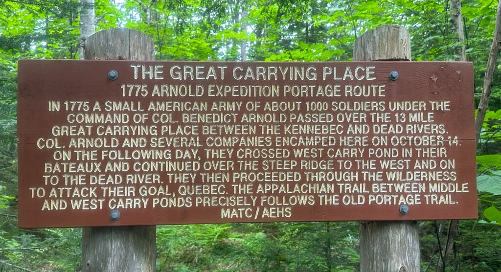 More gentle gradient on the trail today. First along the shores of Flagstaff Lake then West Carry Pond where I heard my first eerie, beautiful loon call on the AT. Benedict Arnold, leading a small army group, crossed this pond in 1775 on the way to attach Quebec.