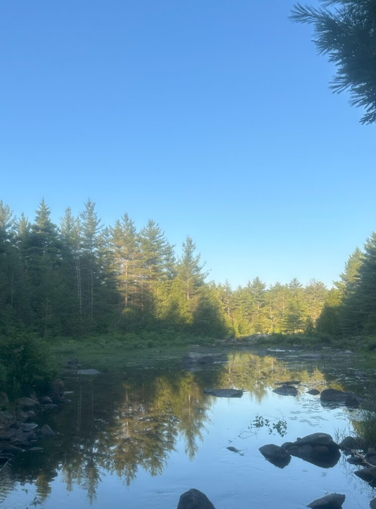 Not as much elevation gain/loss today but plenty of creek crossing and boggy stretches. A trail full of exposed, slippery tree roots was also challenging. Not a bridge to be had so my new, now muddy shoes were temporarily cleaned off while wading across streams and one tricky beaver dam. As it heated up in the afternoon, the gnats got so annoying I put on my head net. It couldn’t protect me from the black flies biting me through my t-shirt on my arms and shoulders.