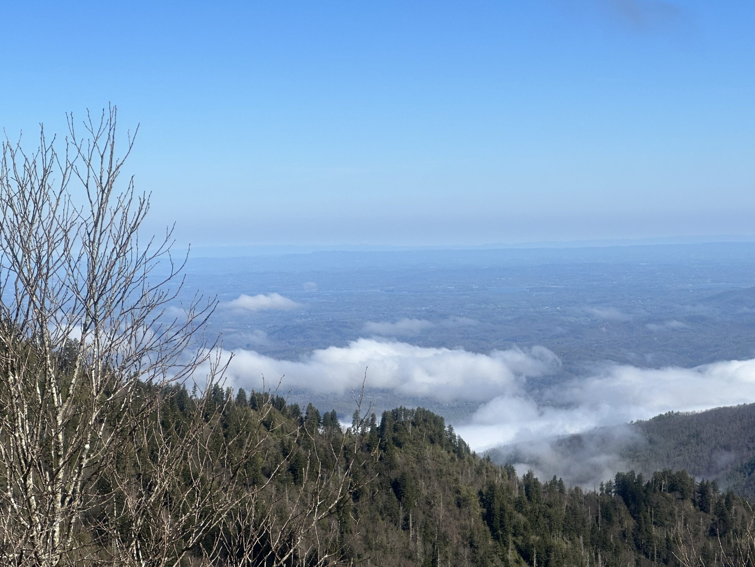 Expansive views of the Smokies, especially from Charlies Bunion, many low-lying clouds far below, left over from the passing storm.
