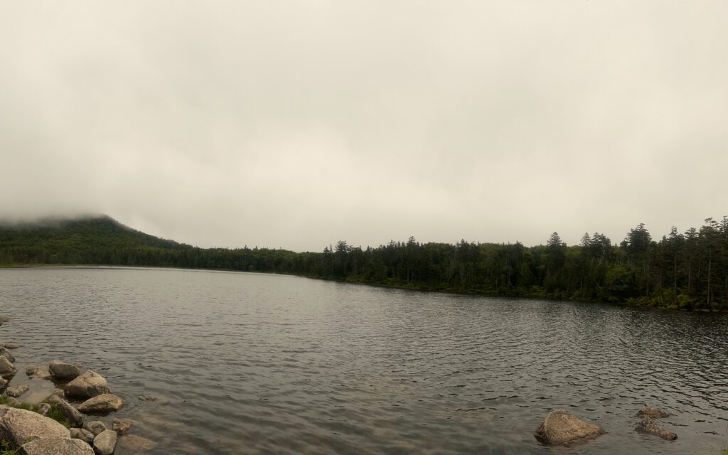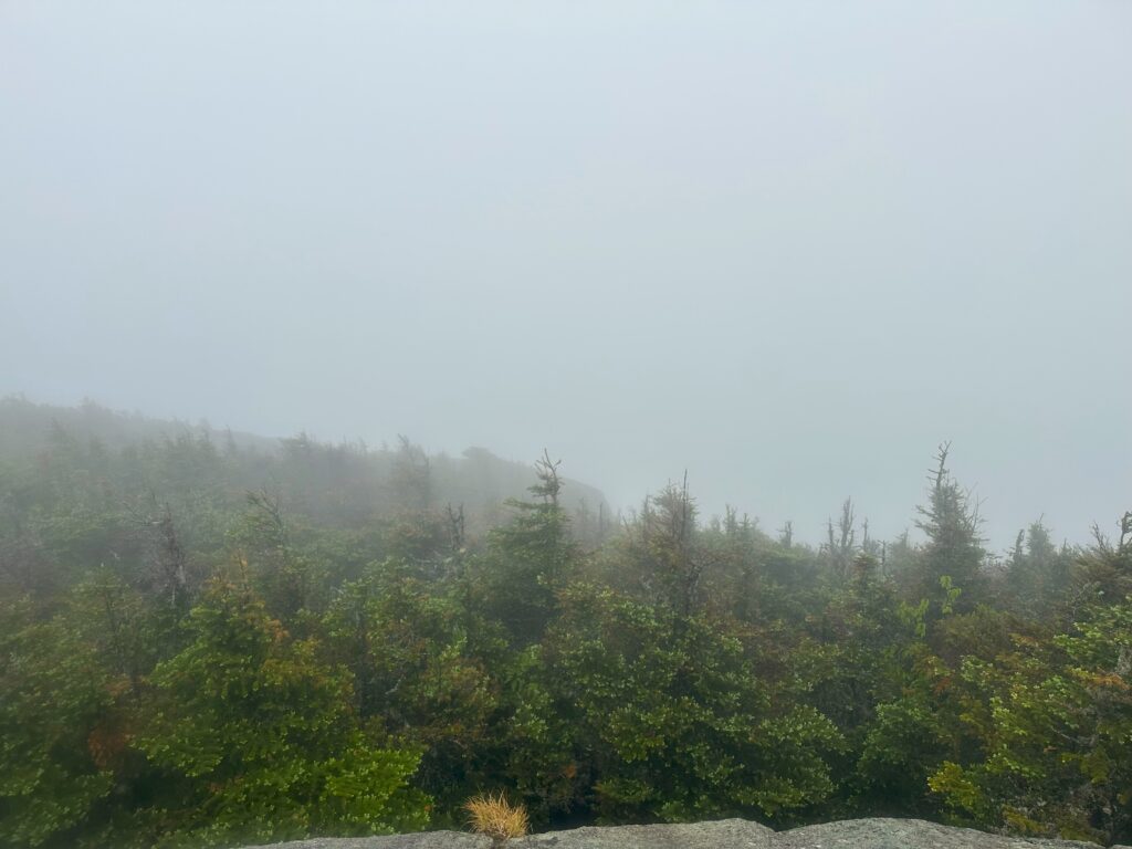 I got a shuttle back to Kinsman Notch for my 16-mile slackpack over South and North Kinman Mountains, both at about 4,300′ elevation. The benefit of this slackpack, basically a day-hike, is reduced pack weight – a lot less strain and easier movement. The challenge with some risk is that you have to finish the entire hike because you don’t have overnight gear. Because of the total mileage, close to 4,600′ vertical and steepness, and rock climbing in places, I figured probably 12 hours of hiking. That’s about how it ended up.