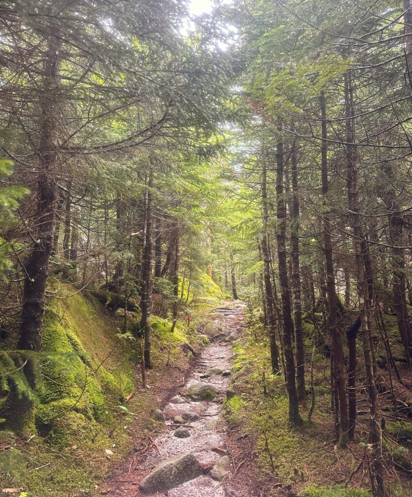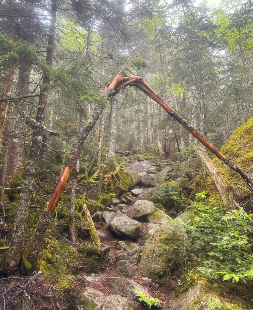 The descent wasn’t as steep as yesterday on Mt Moosilauke but still required careful foot placement on the wet rocks and tree roots. As careful as I was, I let my guard down near the finish on a stream crossing, slipping off a rock and falling into the creek.