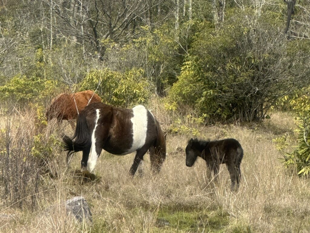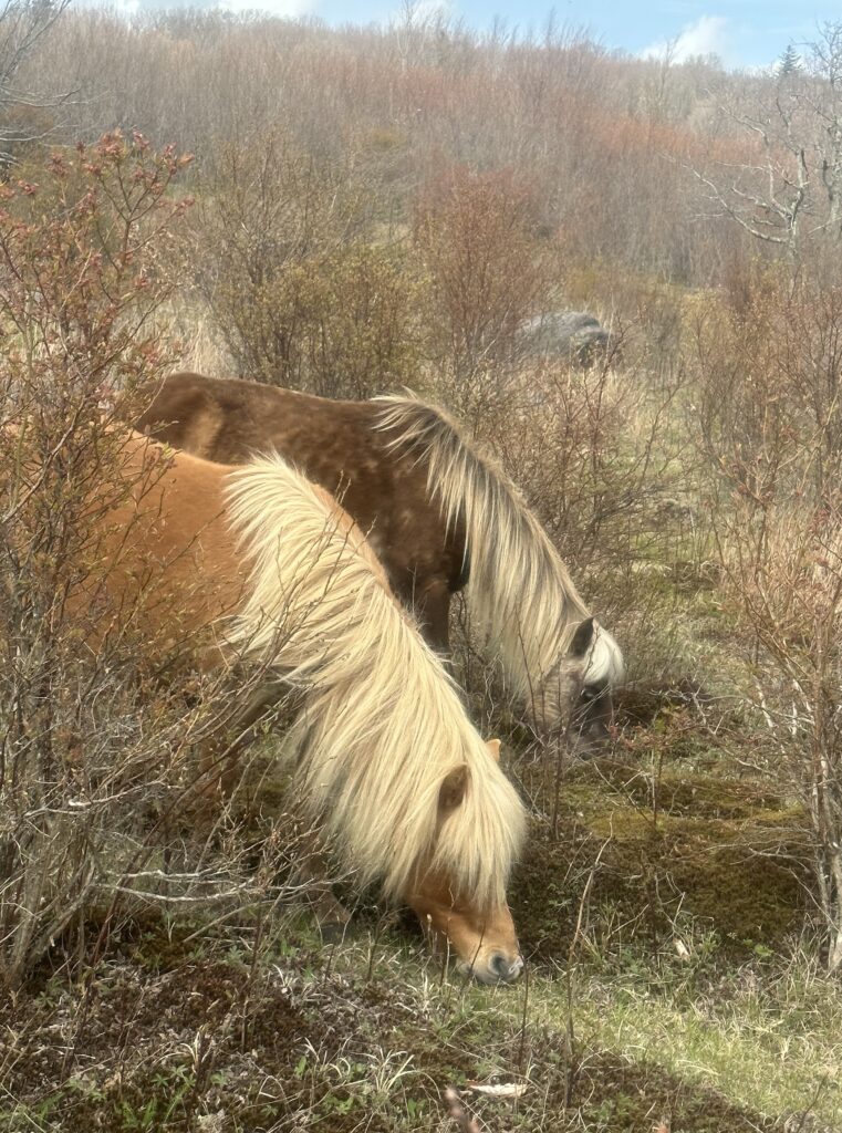 The mist/fog finally lifted and blew out as I continued through the Mt Rogers Recreation Area. A short time later I entered the Grayson Highlands State Park. Quite a crowd of day hikers, but I enjoyed the views and interesting rock formations. Also two herds of small, wild ponies, some with colts, introduced into this state park in the 1970’s. I got through the AT’s renowned Fatman Squeeze without getting stuck!