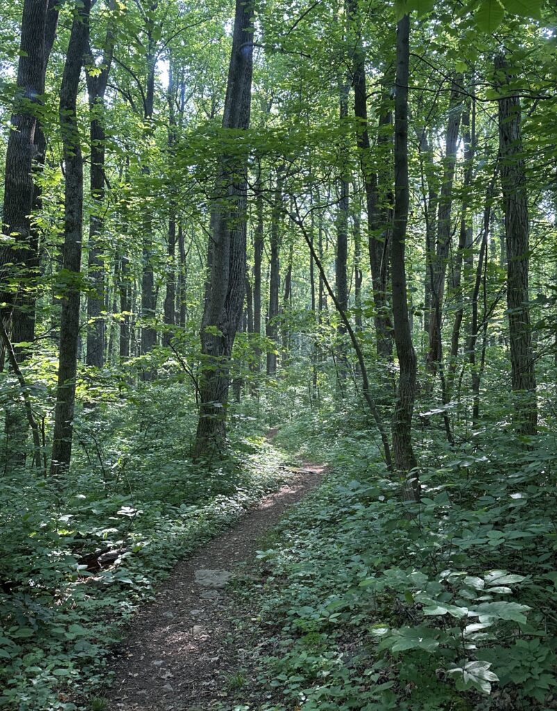 A clear, sunny day on the trail through the sometimes overgrown green tunnel. Saw a trail volunteer later in the day with a weed whacker trying to make some headway.