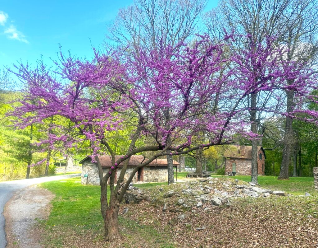 I followed just below the rocky ridge for the rest of the warm and mostly sunny day with occasional glimpses of the countryside below. The tall trees are mostly budded out. I stopped a few times including civil war memorials, one where the two generals from both sides were killed.