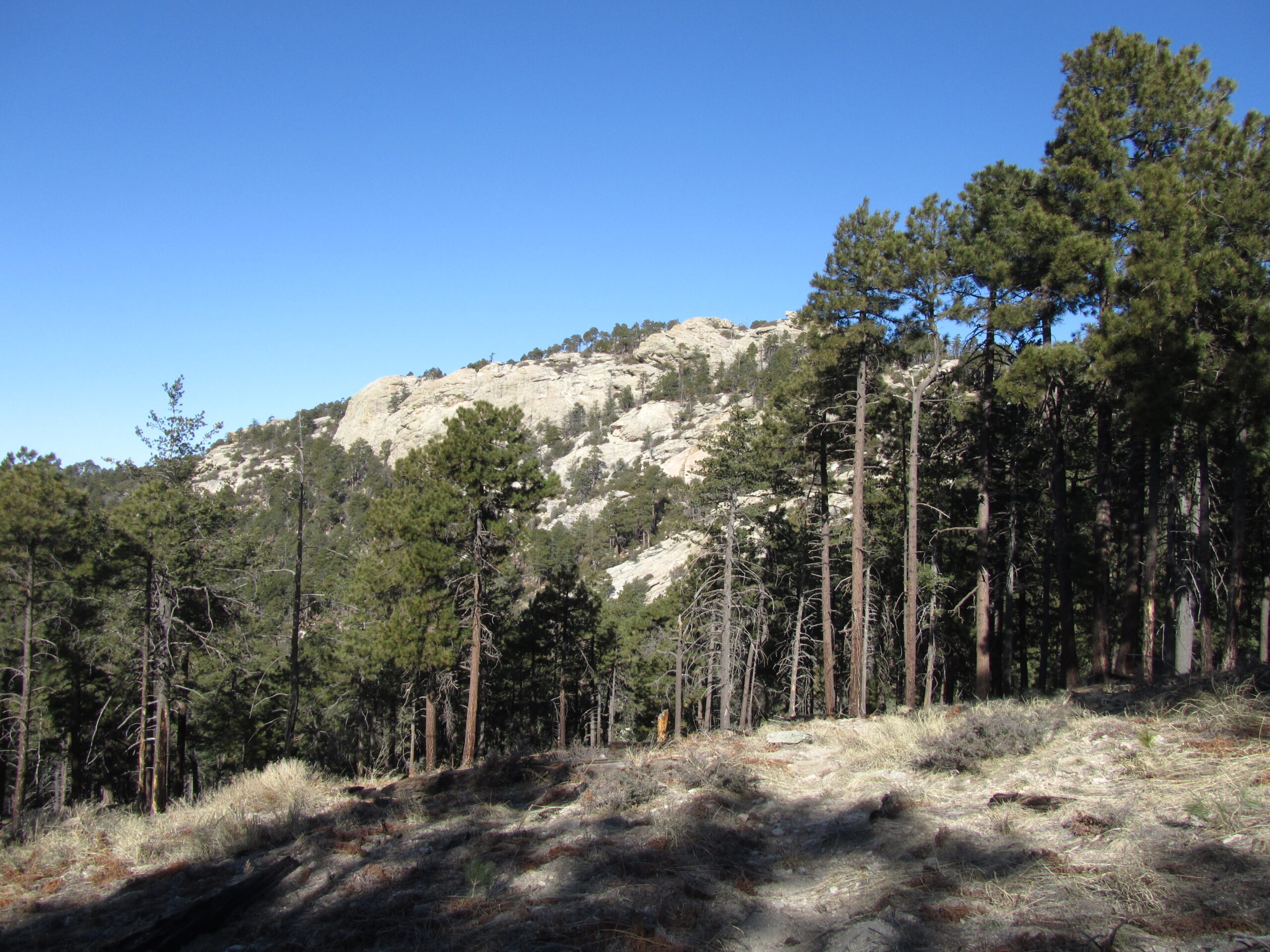 I continued down through the pines, burnt out areas and finally the rocky canyons with nice views of the upcoming Catalina Mountains across Redington Pass.