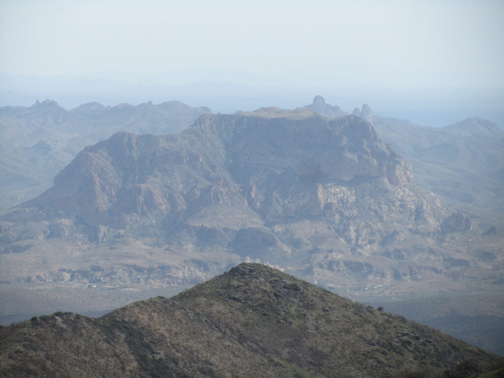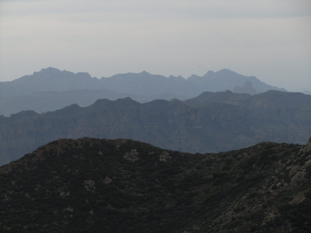 Very pretty desert in this stretch and eventually views of the Superstition Mountains. After a good climb, I could see Weavers Needle through a smoky haze – must be a fire nearby.