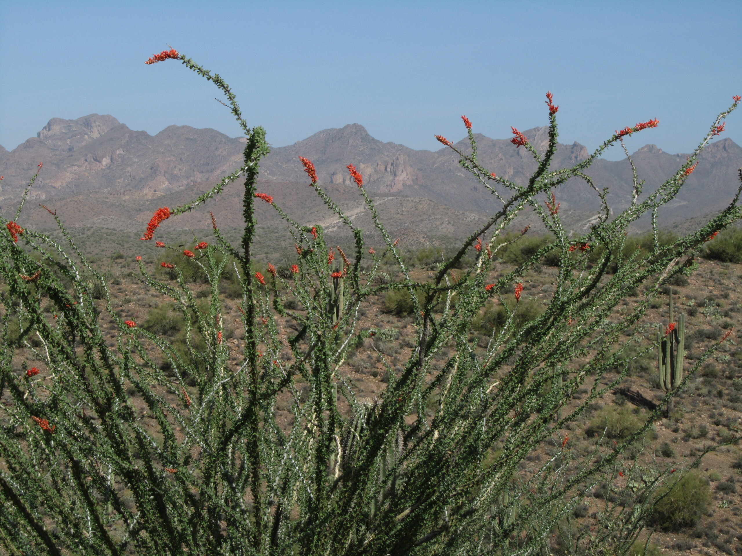 Very pretty desert in this stretch and eventually views of the Superstition Mountains. After a good climb, I could see Weavers Needle through a smoky haze – must be a fire nearby.
