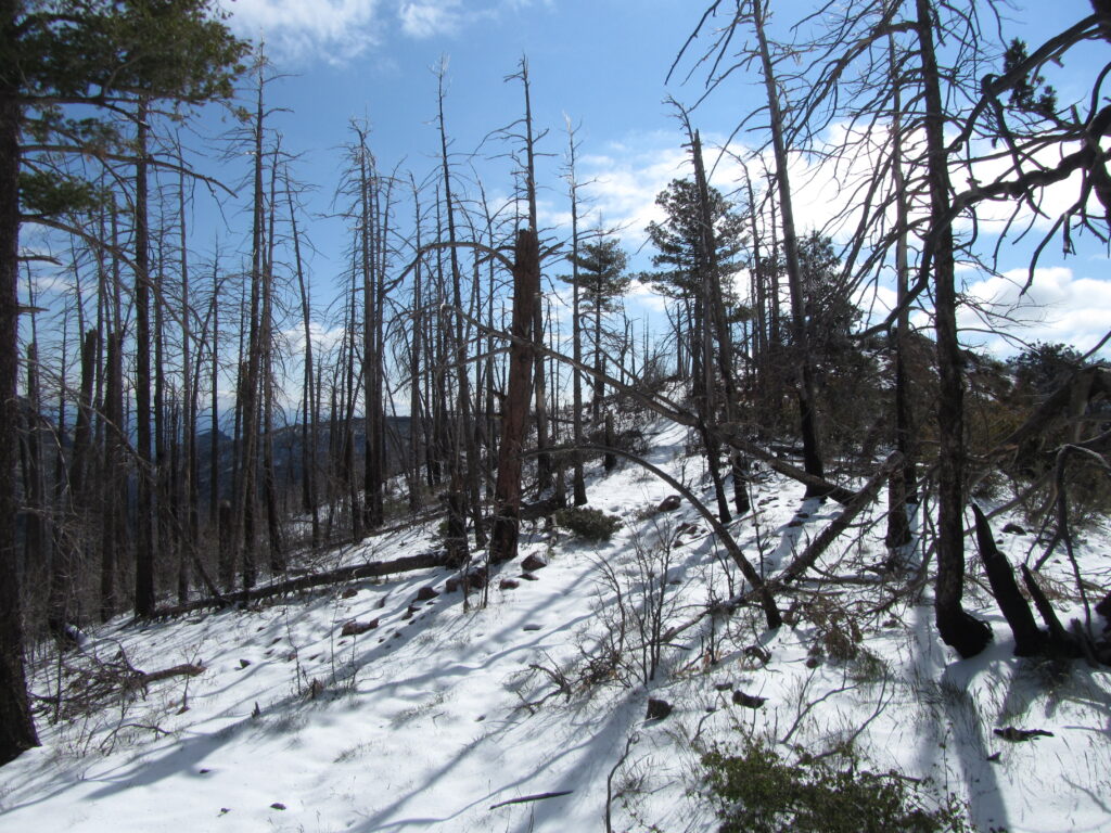 Had lunch and dried everything out at Chisom Spring. I continued down through largely burnt-out areas before reaching The Park, a nice grove of ponderosa pine trees and good camping spots. Warmer tonight!