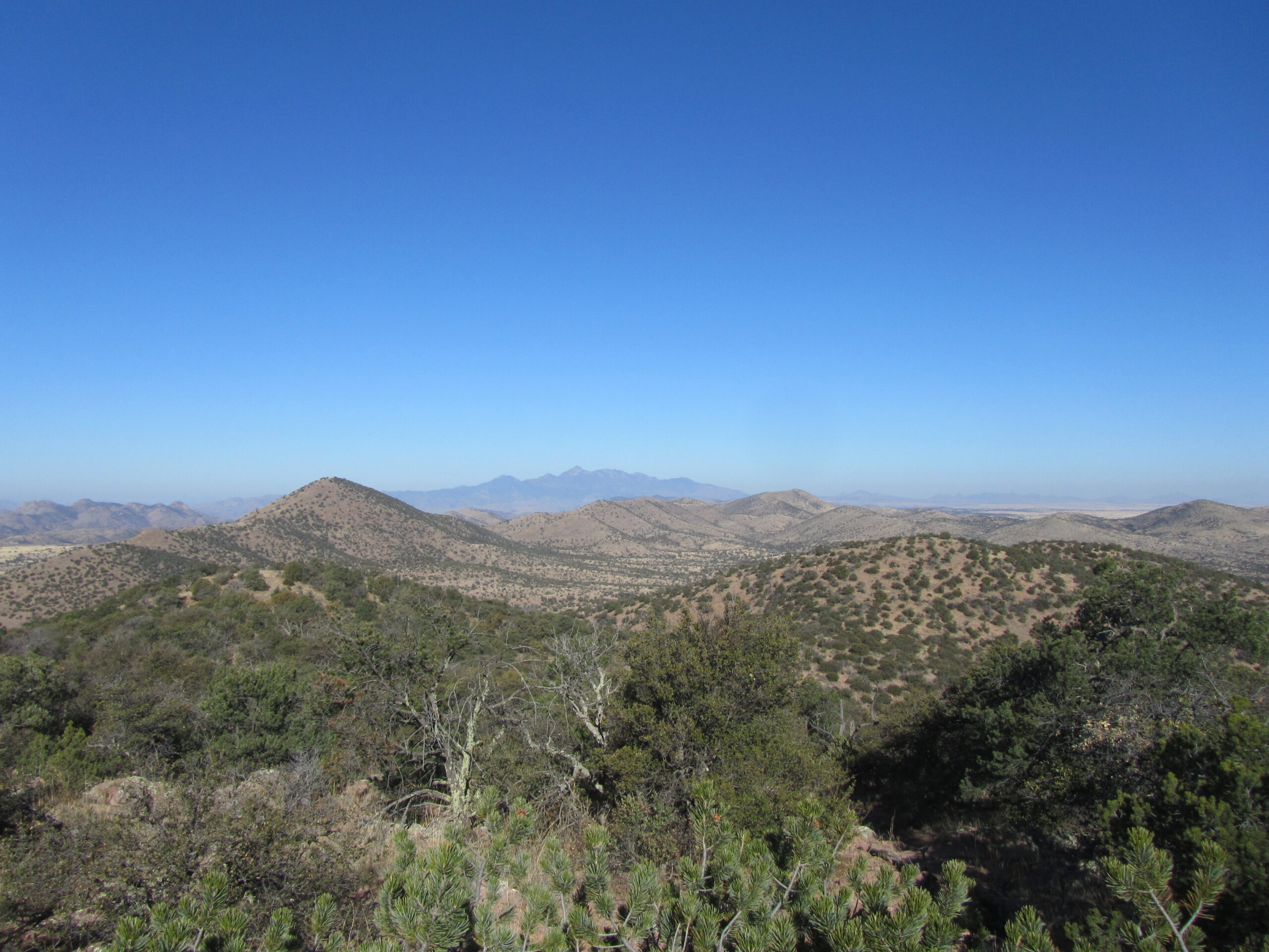 Another bright, sunny day as I entered the Canelo Hills and climbed up and then down to Canelo Pass. At this time, there is a real savannah look to the terrain. Views of the upcoming Santa Ritas and Mt. Wrightson are also emerging. This is certainly real John Wayne country – these vistas have been seen in a lot of western movies.