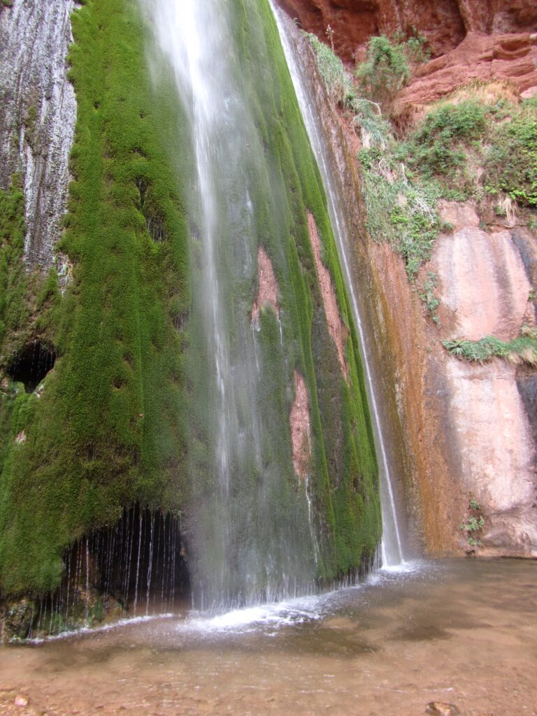 Further on, I took a side trip to cool and beautiful Ribbon Falls and had the whole place to myself. The desert here is alive with color such as the yellows, reds and purples of prickly pear in full bloom. Another example are the bright yellow-green century plants.