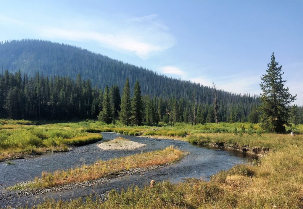 Followed the meandering North Fork through a wide valley for several miles before turning up Pacific Creek to Two Ocean Pass and Parting of the Waters where Two Ocean Creek splits into Pacific Creek flowing to the Pacific Ocean and Atlantic Creek to the Atlantic Ocean.