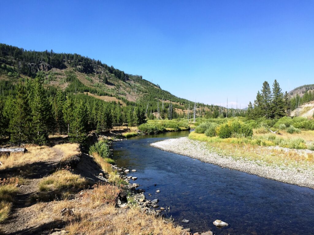 A few miles later I was able to rock hop across the headwaters of the Snake River. I entered Yellowstone National Park at the Fox Creek Patrol Station. All locked up, but I took nice snack break on the porch.
