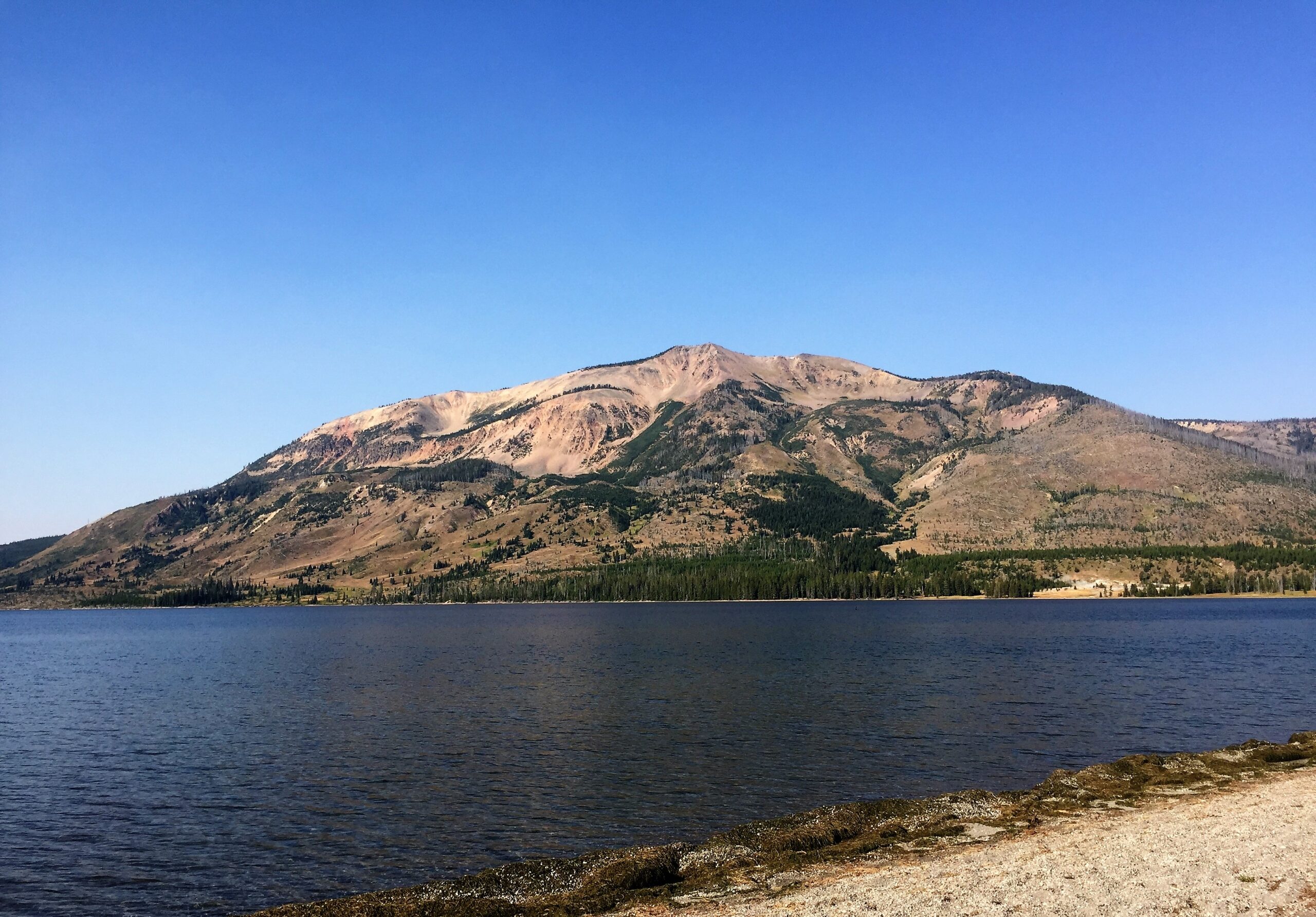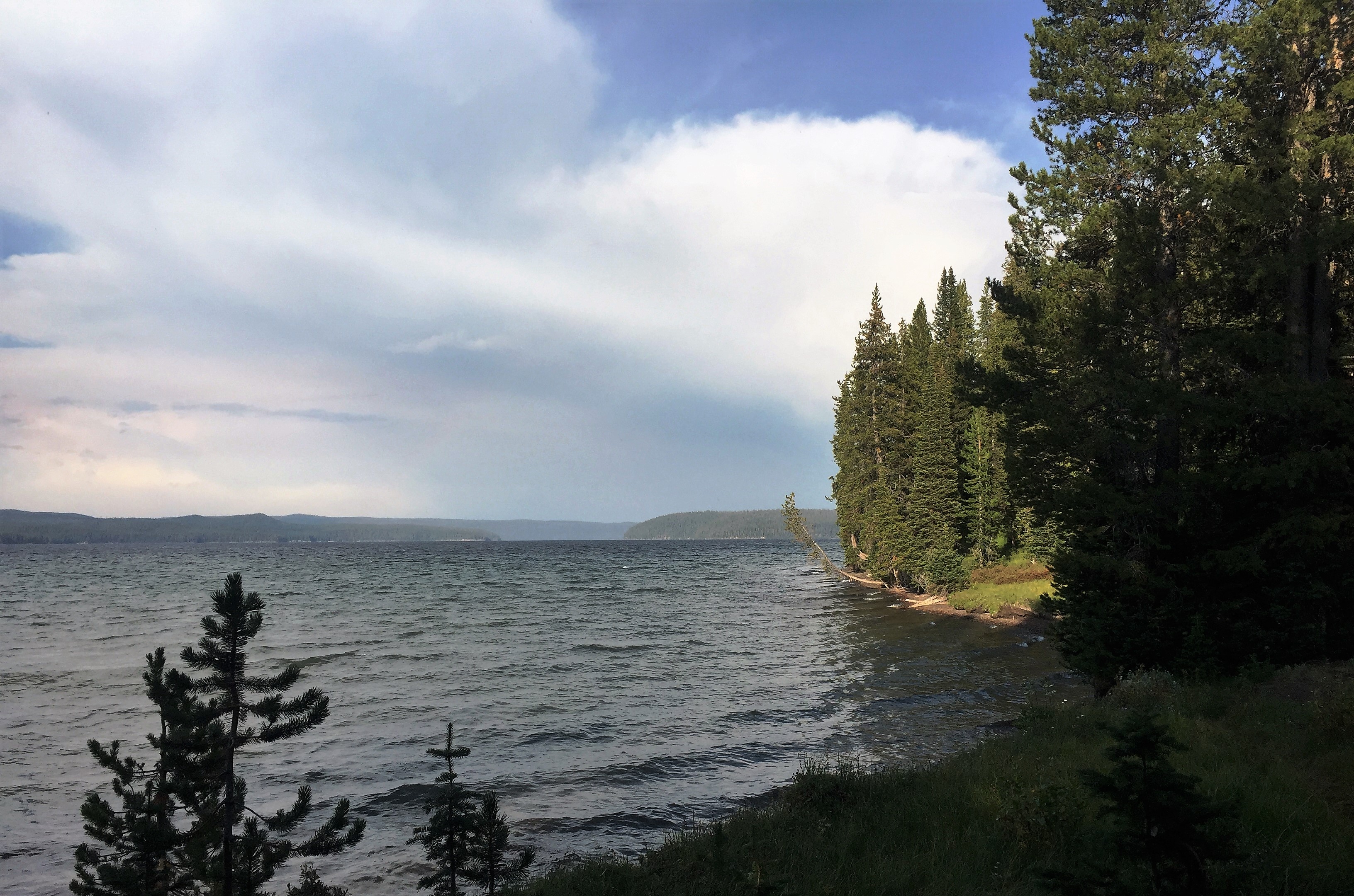 I set off for Shoshone Lake, my next destination. Started in sunshine but thunderstorms moved in and I hiked in a drizzle with some hail. That, combined with fording Lewis Creek, got me all wet again. By the time I got to my beautiful, empty Basin Beach campsite next to Shoshone Lake, the sun was trying to come out again. A stiff wind was sending big waves to the lakeshore. Looks like I will be the only one here tonight.