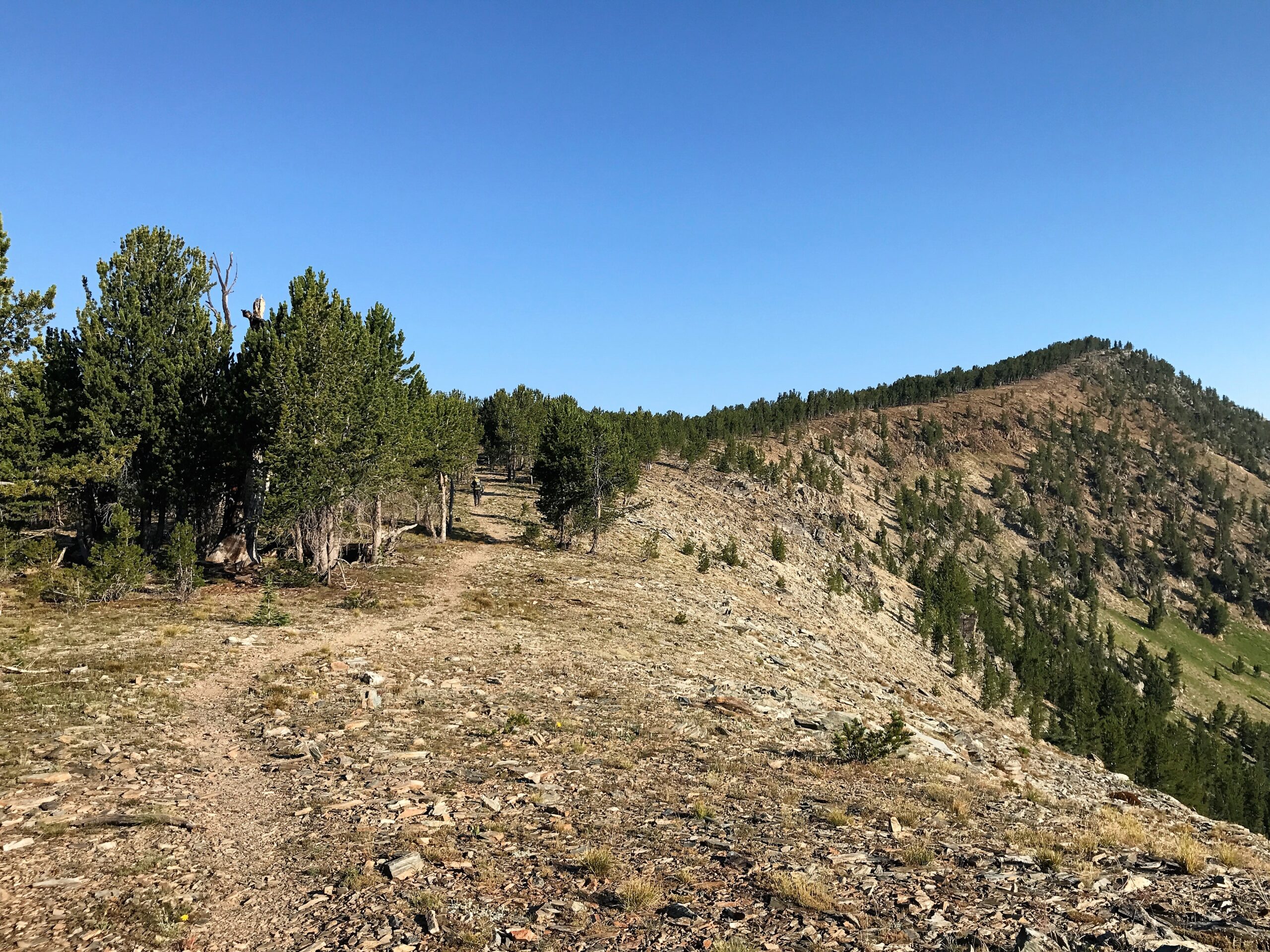 We had a good climb up the Divide this morning with nice views of mountain peaks and big talus slopes. Then mostly downhill and flat through pine forests and grassy meadows until the end of the day.
