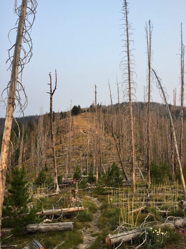 Lots of old burns and pointless ups and downs today. The trail religiously follows the Divide which is the ID/MT border, no doubt the original path of the survey crew that installed the border markers.