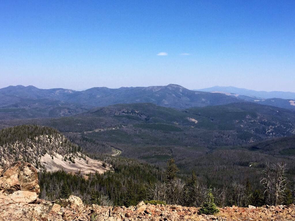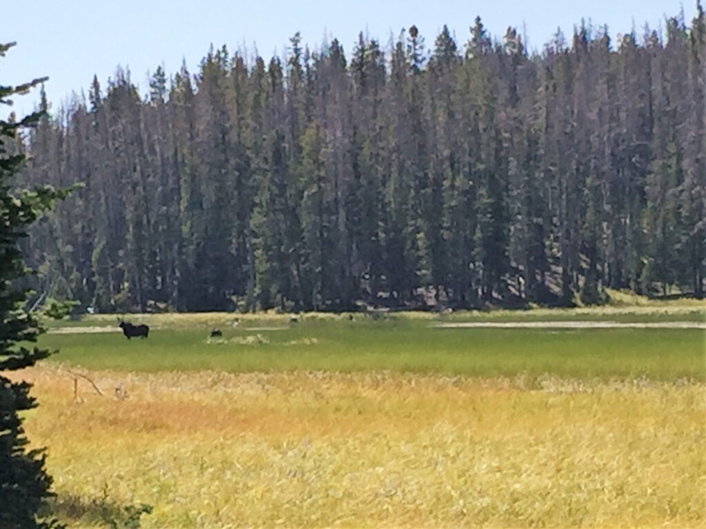 Late in the afternoon, I was hiking through a thick stand of small lodgepoles with poor visibility on either side. Suddenly, a large black bear walked out on the trail 75 ft in front of me. He stopped, turned and stared at me. Get a pic? No, I had surprised this one and I didn’t know if there was a cub around, so I raised my poles over my head to look bigger and growled as loudly as I could. The bear took off like a rocket and went crashing through the woods.