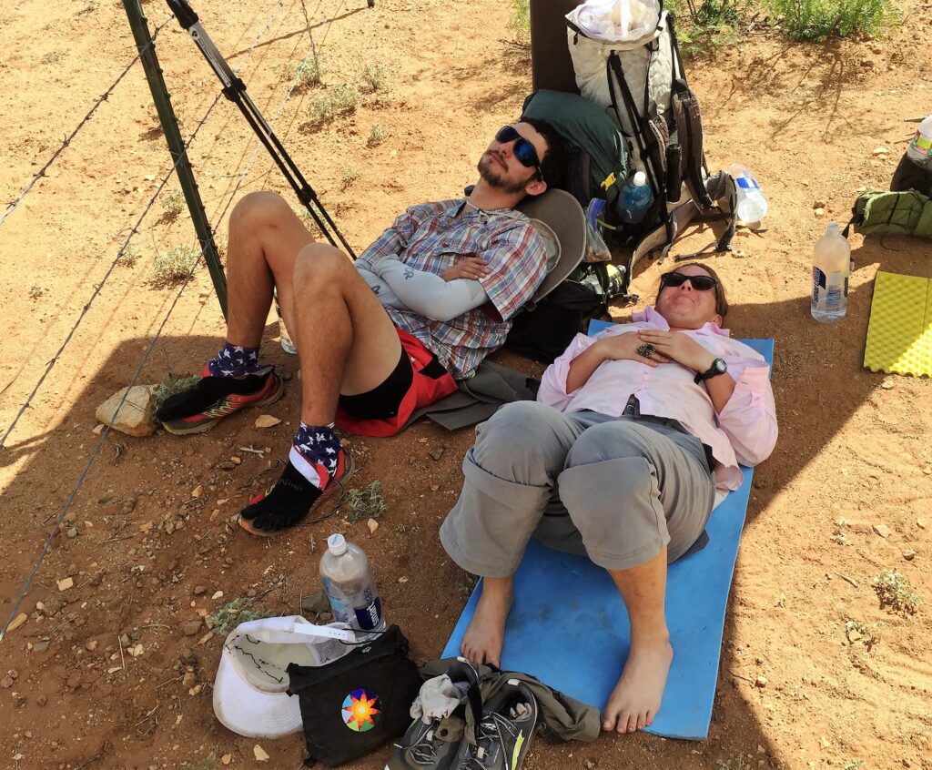 Hot and thirsty on arrival at the water cache and seeking shade, Trivia, Tragic and I shared a small and diminishing patch of shade provided by the CDT info sign across NM Hwy 81.