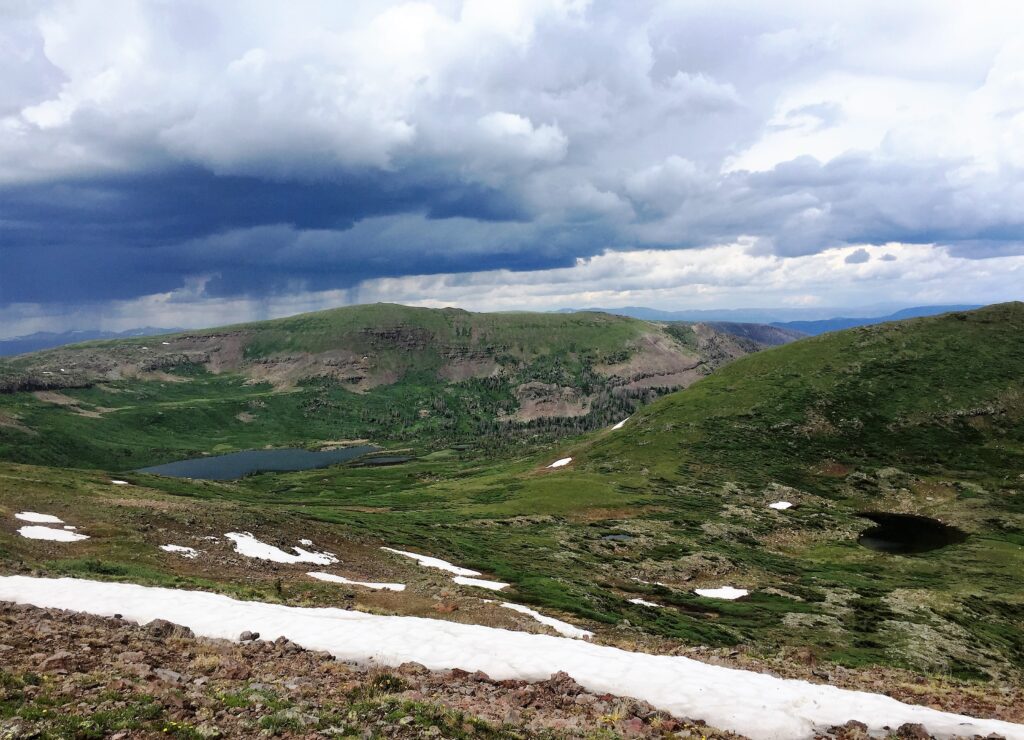 In a thunderstorm drizzle, passed Willams Lake far below, climbed another pass before dropping down to Squaw Pass. Looking hard for a flat spot to set up camp in the rain and saw a tent. A hiker out for a few days – first person I have seen since leaving Wolf Creek.