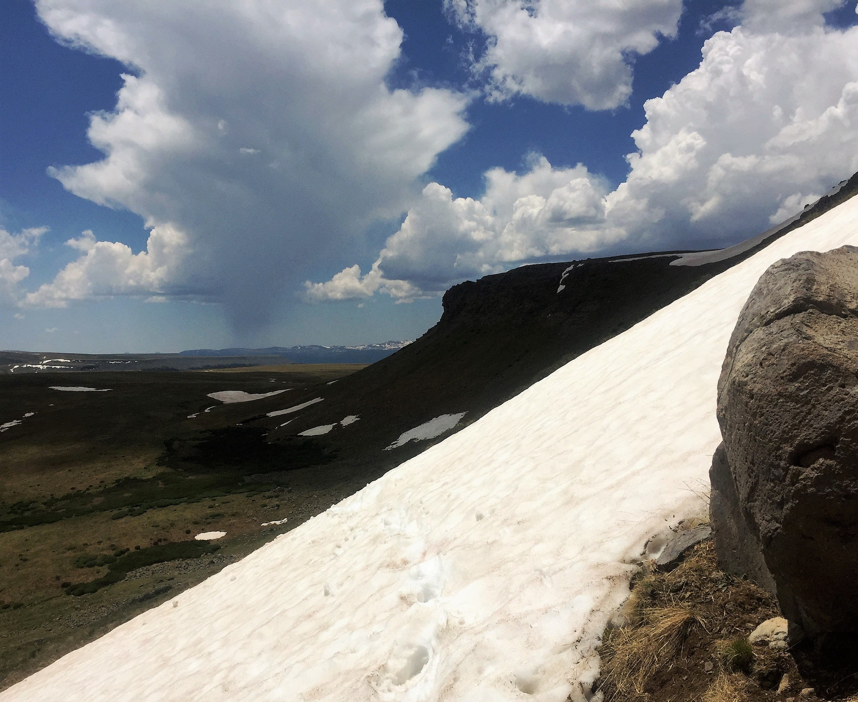 Mrs. Haze and Ellie, our lab, joined me for the first three miles from Spring Creek Pass to Snow Mesa at just over 12,000 ft. Only a few patches of snow left on the mesa. After a sad farewell, I trudged on.