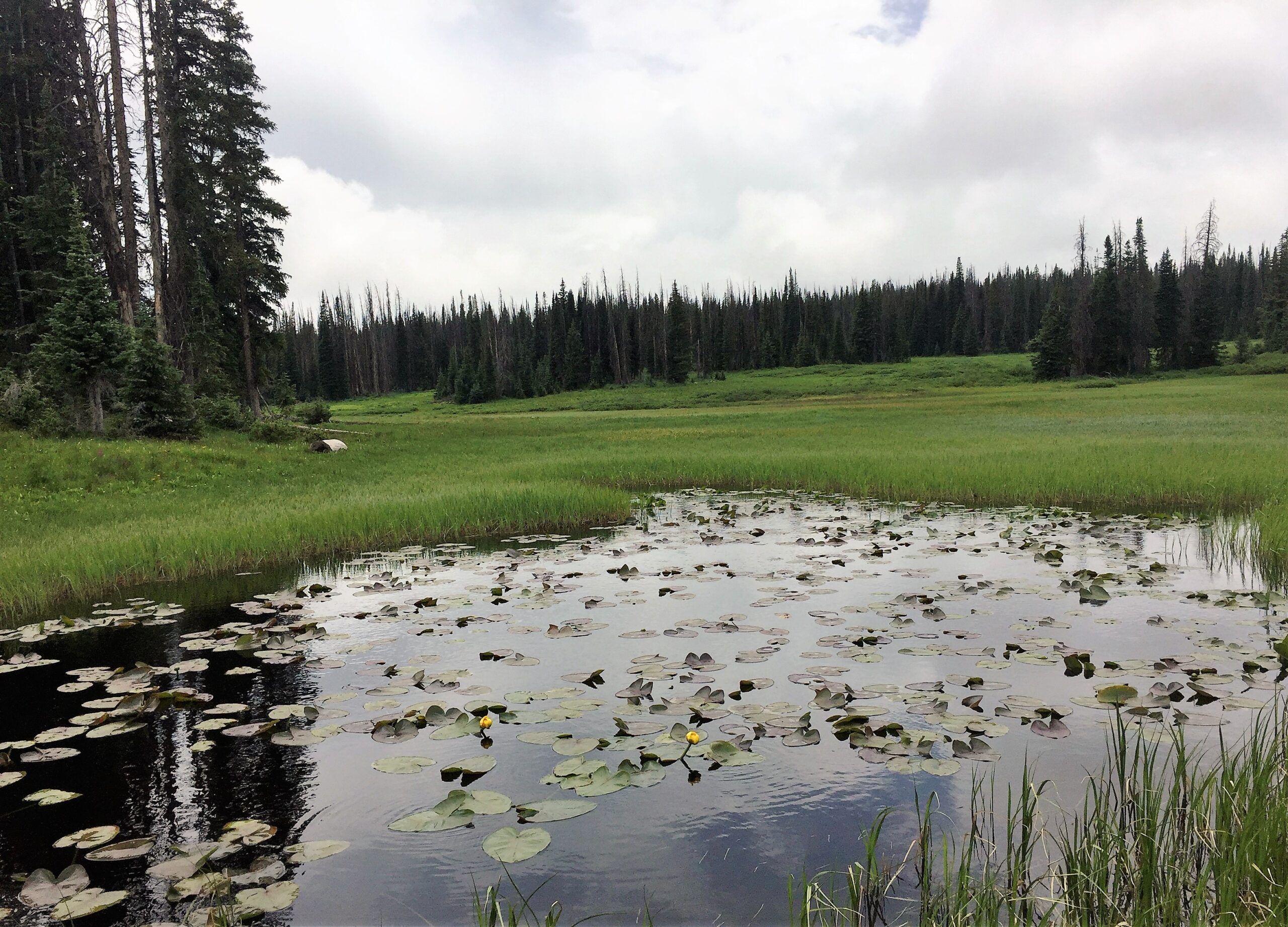 Lots of lakes, forests and meadows but not a lot of elevation gain until reaching Mount Zirkel Wilderness in the afternoon. The landscape changed rather dramatically as I started climbing with rocky crags, huge granite slabs and boulders, hummocky meadows, yellow flowers and great views to the valley below.