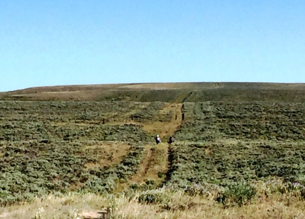 I hiked mostly dirt roads all day with no shade. The landscape was rolling hills covered primarily with sagebrush.