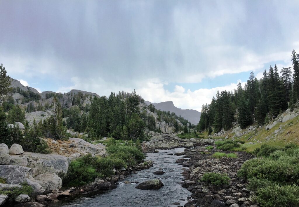I got an early ride to the Elkhart TH to resume my journey through the Wind River Range. Ten miles got me back to the CDT at Little Seneca Lake and then on to Freemont Crossing for lunch. A brief shower made me glad to have my rain jacket back.
