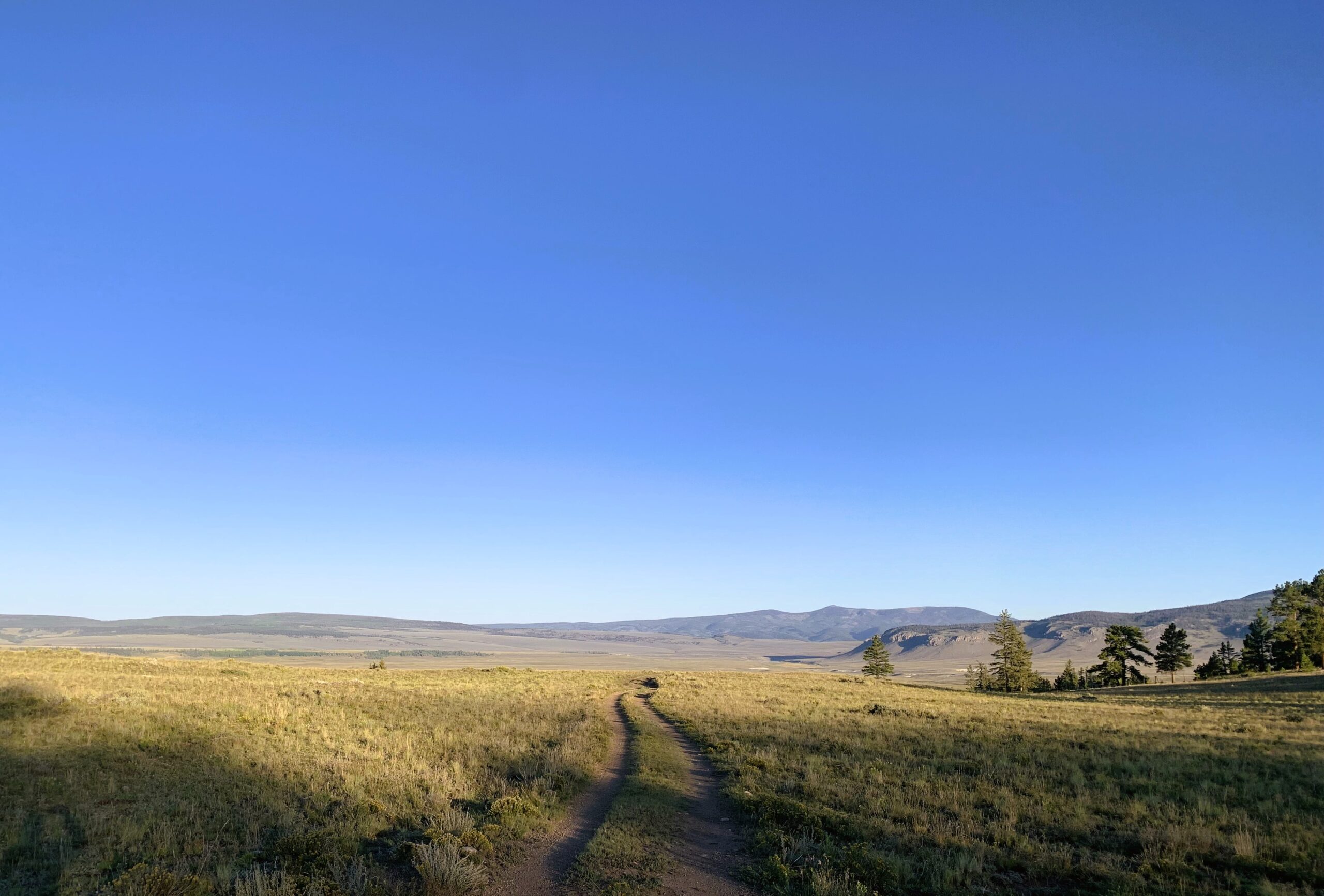 A fast pace this morning through the Gunnison NF across large meadows and in and out of dry or muddy drainages. Definitely in cattle country now unfortunately highlighted by a dead cow practically in Ant Creek. The smell was absolutely horrible and I sped up – needed water but not that bad.