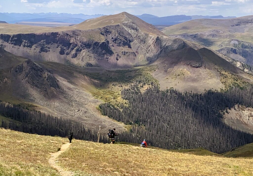 Another steep climb got us to the highest point of the day at 12,800 ft back on the Divide. From here, we could see Snow Mesa far below. Time for lunch and a needed rest. Met some hunters leading two llamas to reach and carry out an elk they had bagged earlier. Now a steep descent past Middle Mineral Creek and the last forest-sheltered area before Spring Creek Pass.