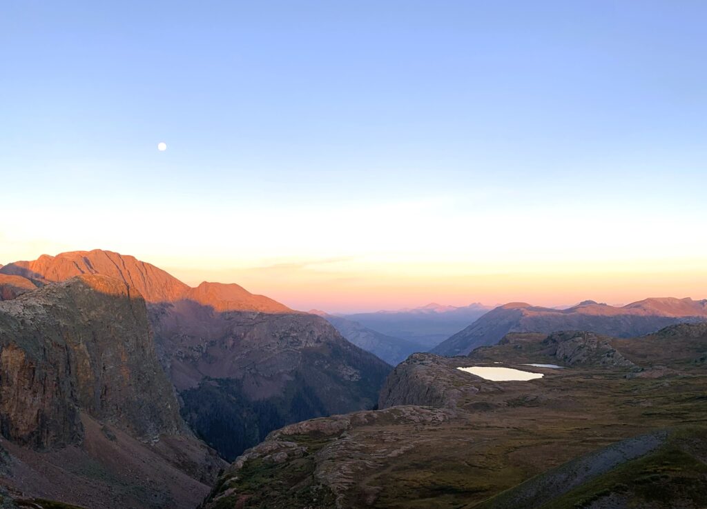 First a climb to the Divide at sunrise with magnificent mountain views then down an impressive set of switchbacks that led to the Elk River drainage.