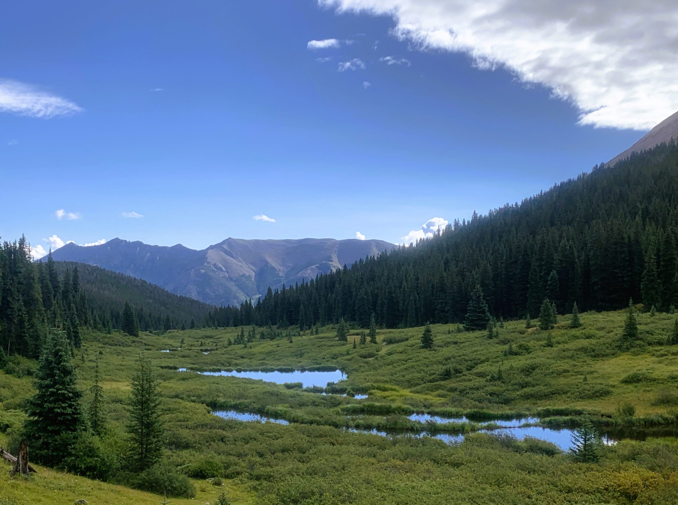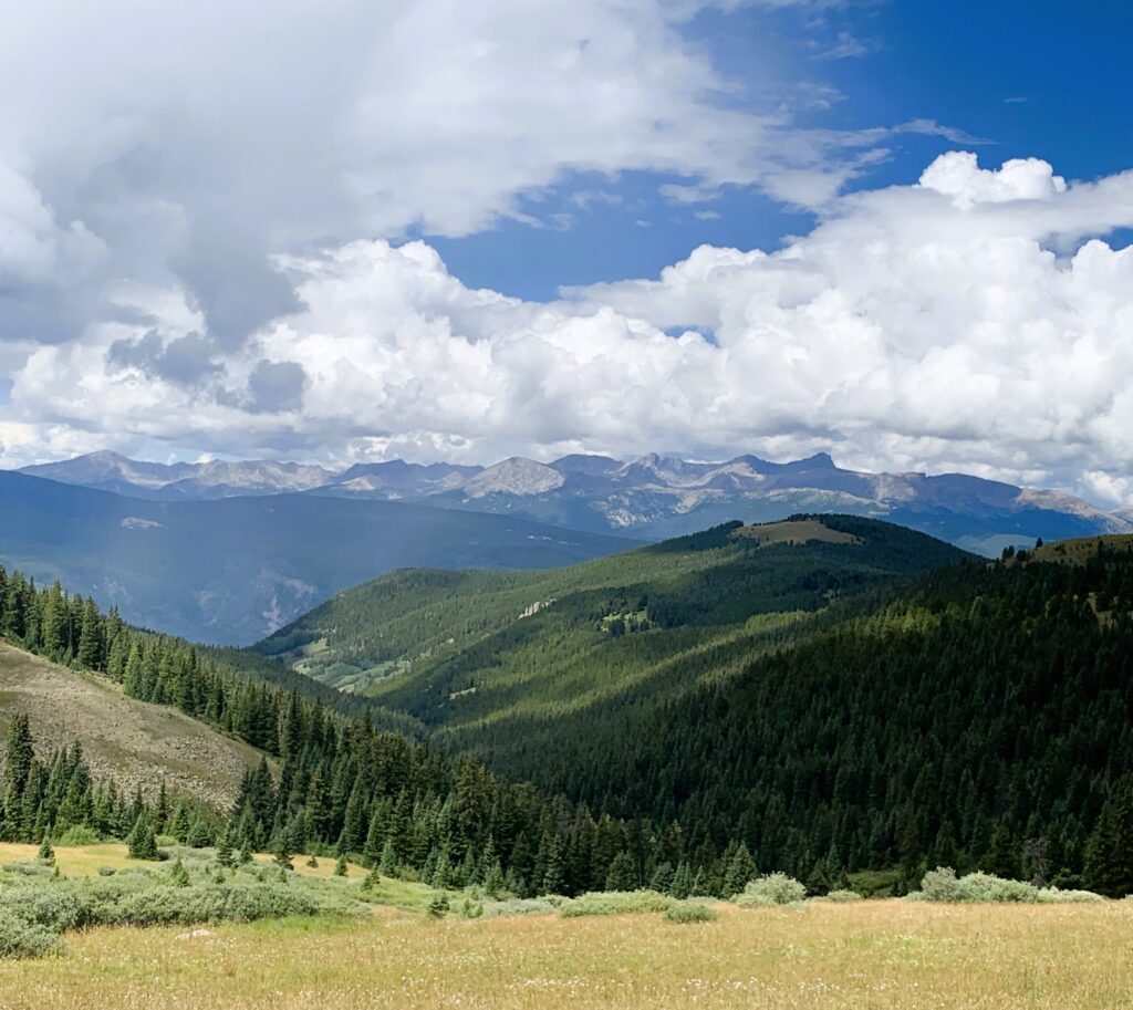 With the clouds starting to thicken, I headed down the other side and picked up Cataract Creek. I followed it to a nice lunch spot. Interrupted by raindrops, I got further down to Cataract Creek crossing, filtered water and waited out the heavy rain. After about an hour, with light sprinkles, I resumed the descent to Camp Hale, the site of a U. S. Army training facility during World War II. The trail then cut across the East Fork Eagle drainage and turned up the South Fork Eagle drainage paralleling Hwy 24.