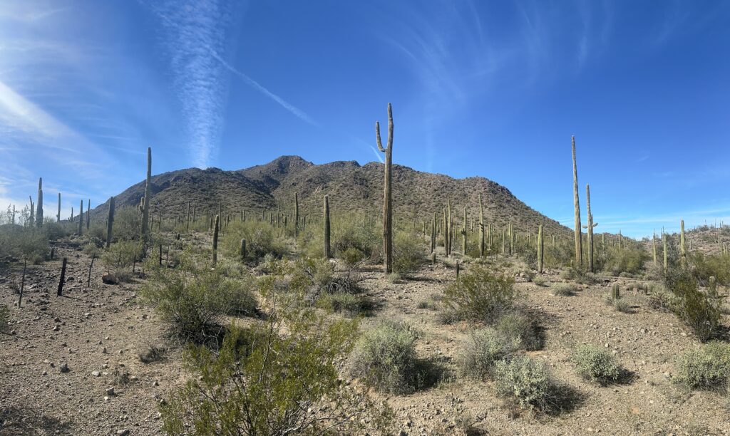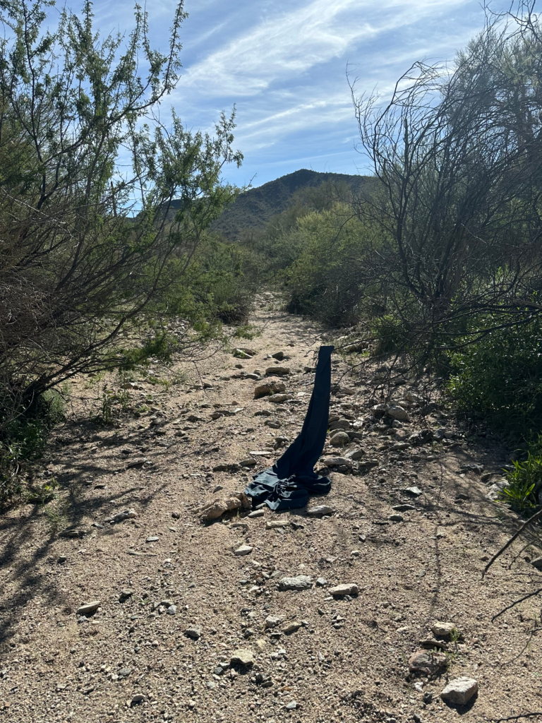 Much of the x-country travel is up and down washes which sometimes can be better tread than rocky trails. Today I had taken off my warm hoodie and draped it around my pack, loosely tied down. While walking down a narrow wash, a mesquite tree gently lifted the hoodie from my pack. I can’t count the half-mile it took me to go back and retrieve it once I discovered it was missing.