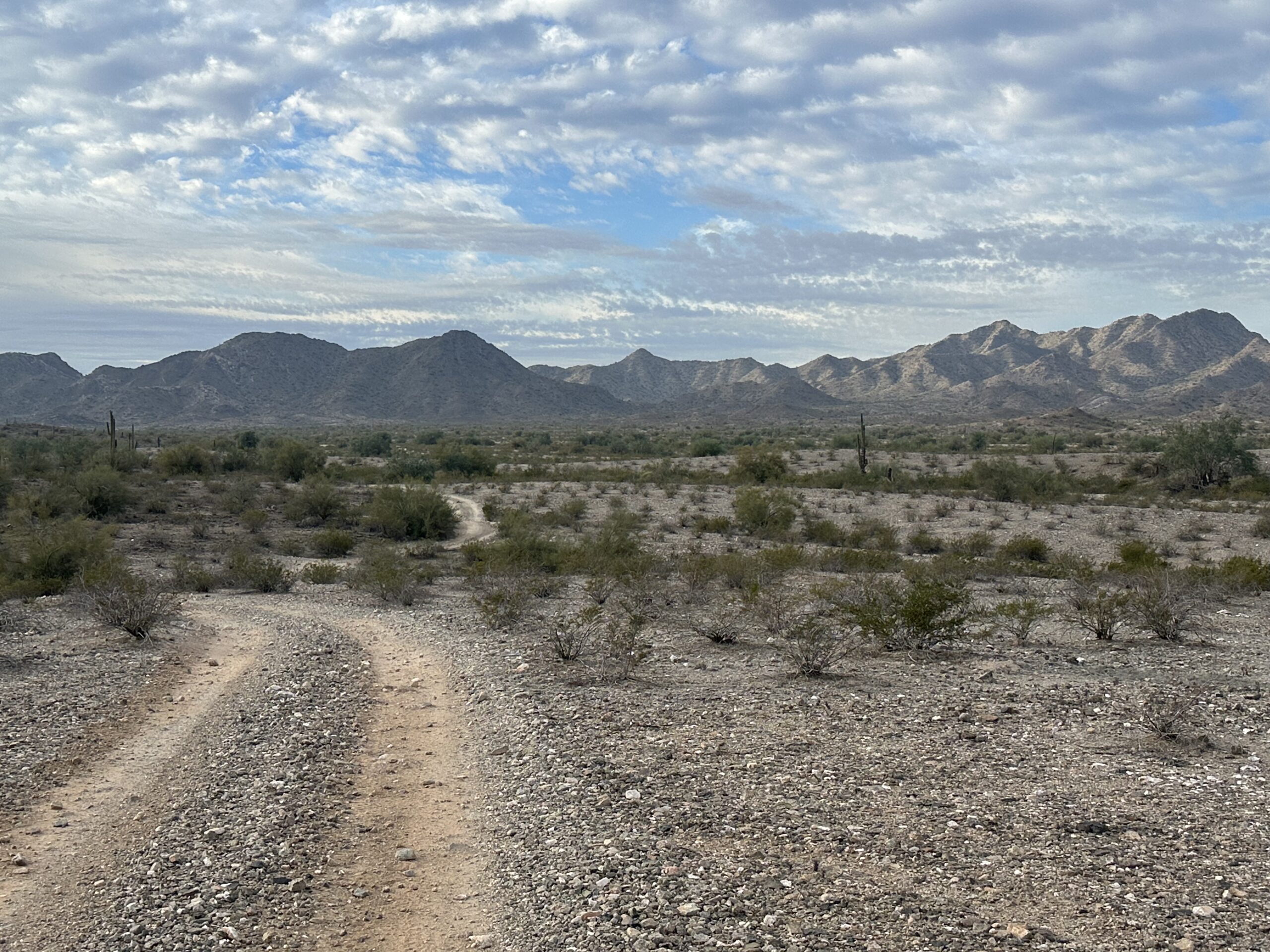 After walking east through irrigated fields, I headed south to the Buckeye Hills. A 600’ climb got me over a ridge to the other side. The Sonoran Desert landscapes are still with me, rolling hills, wide-open desert vistas and rugged terrain.