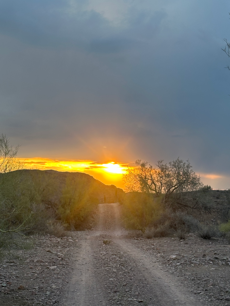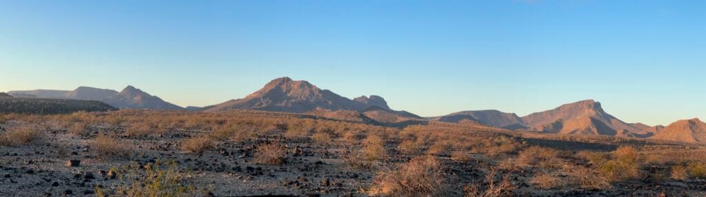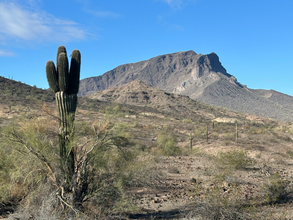 One of the longer x-country sections on the trail thus far through the Woolsey Peak Wilderness, first climbing up a very rocky ridge, then up and over washes on the eastern slope of Mt Woolsey (3,270’) crossing a few miles on the volcanic rock covering the desert floor and finally reaching a closed-off, primitive road. This 64k-acre wilderness area was protected in 1993 and sits within a portion of the Gila Bend Mountains.