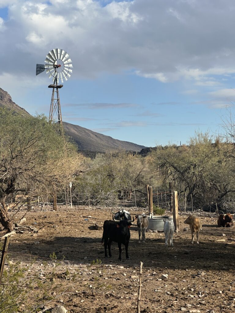 This road took me north up a valley on the west side of Woolsey Peak and along the way, I met my first hiker, I don’t know who was more surprised. Liam, from Wisconsin, started near San Diego and generally following the DWTH in reverse. I say generally because he doesn’t have all the beta for the trail. He says his ultimate destination is Lordsburg NM. After a nice chat, I eventually reached the boundary of the wilderness area and a windmill and troughs to refill my water bottles. The cows voiced their disapproval over the intrusion.