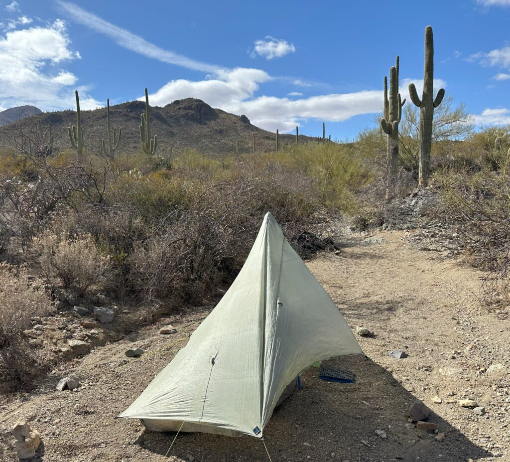 Got to my campsite in the afternoon and set up my tent. I had placed the water bottle behind a thorny thicket above the wash. I found the water bottle several feet away from the thicket. The top of the bottle had been nearly ripped off and no water remained. Probably a thirsty coyote or bobcat. I’ve cached a lot of water and never had this happen. I fortunately had packed enough extra water just in case to get me over the mountains tomorrow to the Visitors Center.
