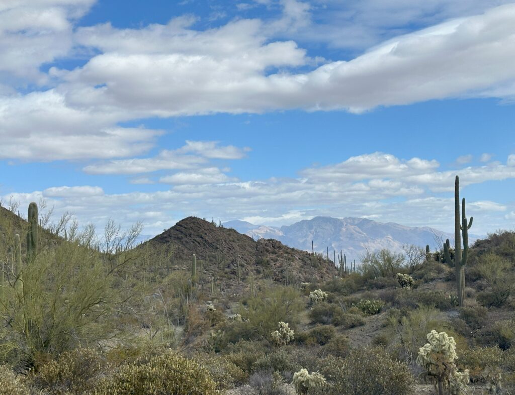 It was a cool hike today with lots of colorful volcanic rock and plenty of saguaros.