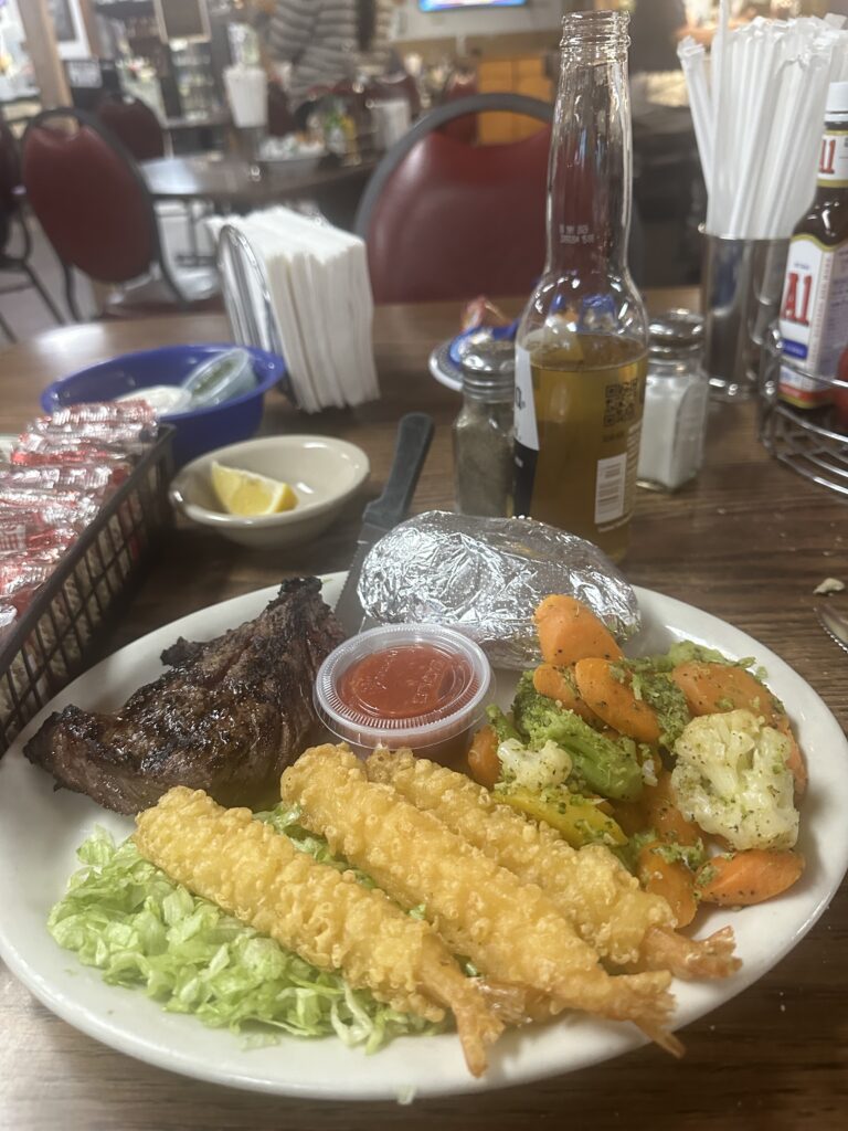 I hobbled to the Best Western on my battered feet and ankles, my oasis in the desert. Hot shower, washed clothes and had a tasty surf and turf dinner at the Crossroads restaurant. What a day, I think I’ll sleep well tonight.