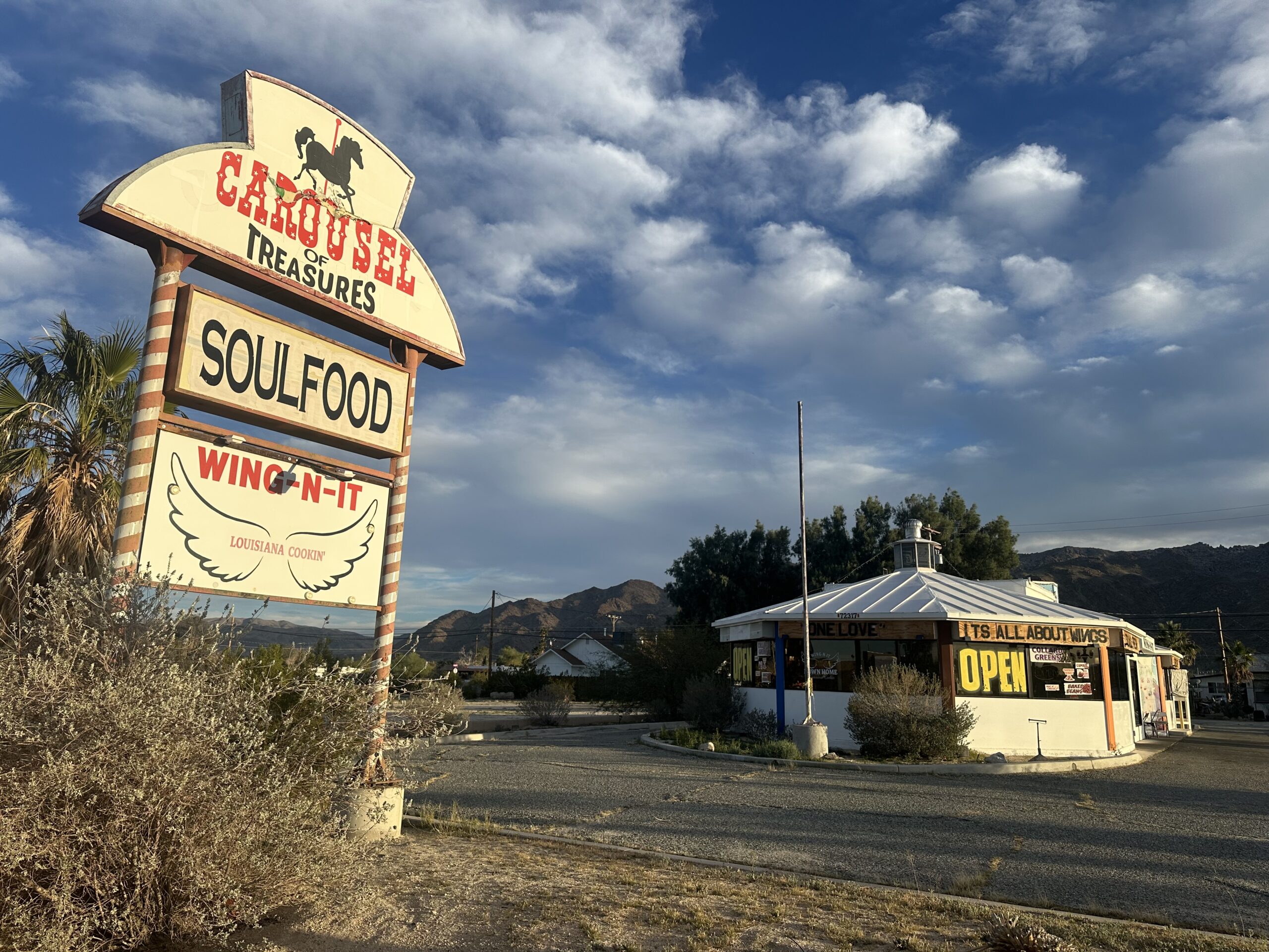 Washed clothes, cleaned up and headed to nearly Wing-n-it, advertising Louisiana soul food, seemingly out of place in the Mohave Desert. Let’s just say I got my fill of spicy wings, fried fish, shrimp and potato salad – a pleasant surprise.