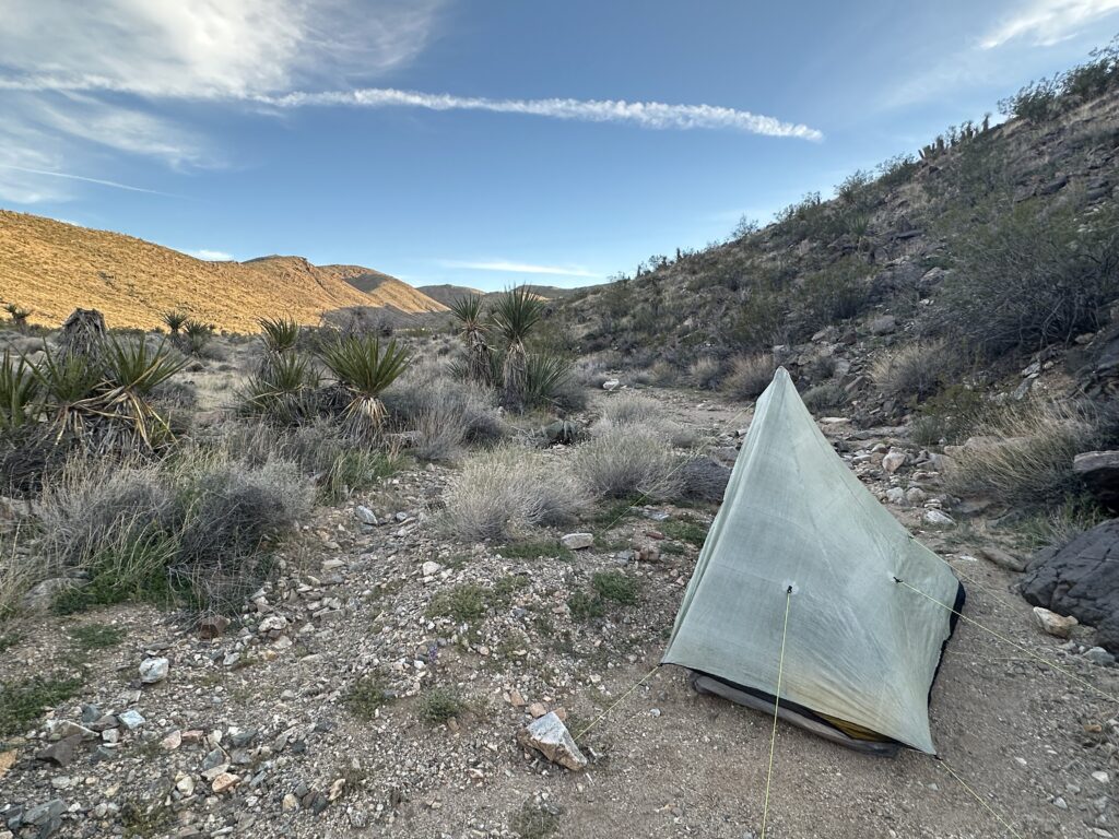 Late in the afternoon, a climb up an old mining road got me to a ridge and the eastern boundary of Joshua Tree National Park with good views westward into the Park. I took advantage of the elevation and phone signal to check-in with Mrs Haze. She informed me a JTNP ranger had contacted her after not being able to reach me. The ranger told her they couldn’t approve my backcountry reservations because I had to watch a video and be told of the dangers and dos and don’ts. Mrs Haze explained I was a seasoned hiker at the end of hiking through the Sonoran and Mohave deserts and wouldn’t start any fires within the park. Must have worked because the ranger approved my permit – thanks Mrs Haze and Ranger Diana!