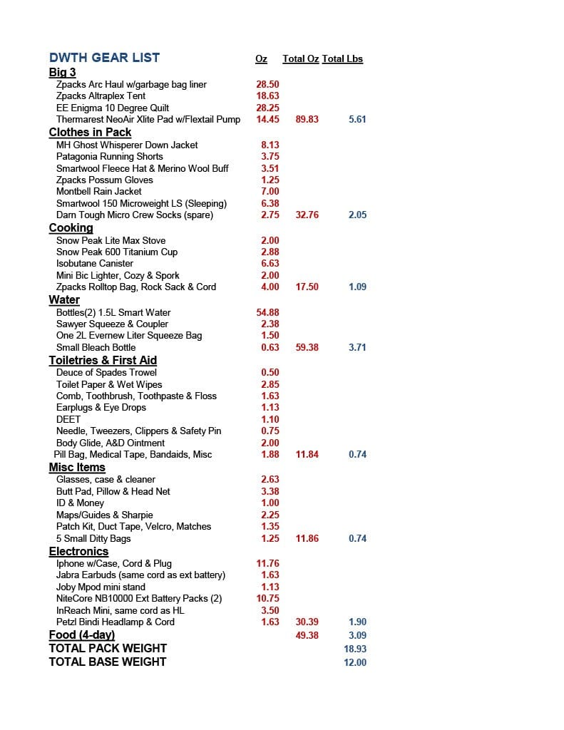 I have included the gear list for my latest adventure but it hasn’t changed much the last few years. I carried a bit more on the AT due to inclement weather but didn’t have to carry much water. So weight wise not a big difference.