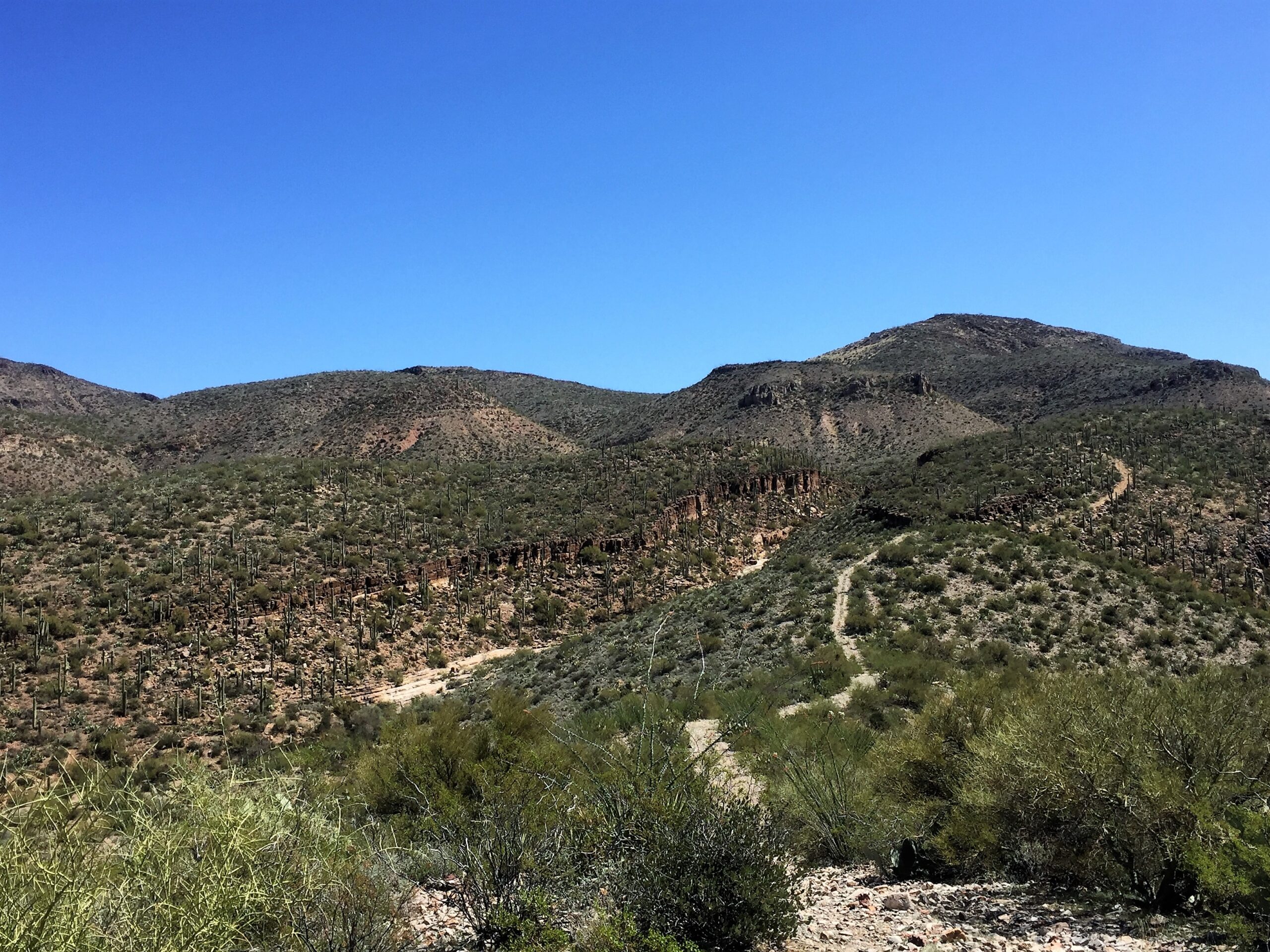 My progress was temporarily halted at a small box canyon. I managed to find a steep route to the top of the canyon, along the top, then back down through thick vegetation to the other side. Met up with another jeep track to a high ridge looking down on Aravaipa Road near Brandenburg Ranger Sation.