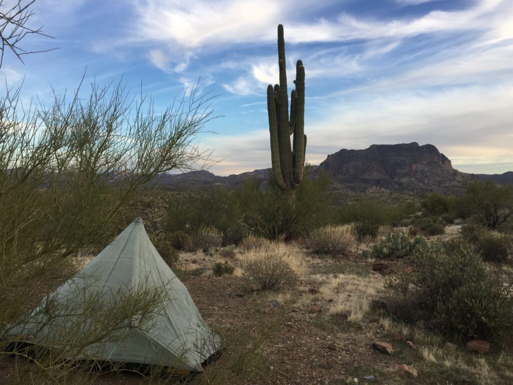 Not seeing any camping nearby that was rock and poop free, I kept going through Whitford Canyon, crossing FR650, and climbed to a hill overlooking Picketpost Mountain, the lights of Superior, and, in the distance, the glow of the Phoenix Valley. Someone had been working very hard to clear enough rocks to lay a tent down.