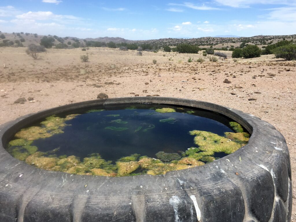 I walked north out of town on dirt roads then cut east cross-country through flatlands. Then dipped into La Jencia Wash and got water at an electric-powered well. The tank was busy with windblown cows and calves.