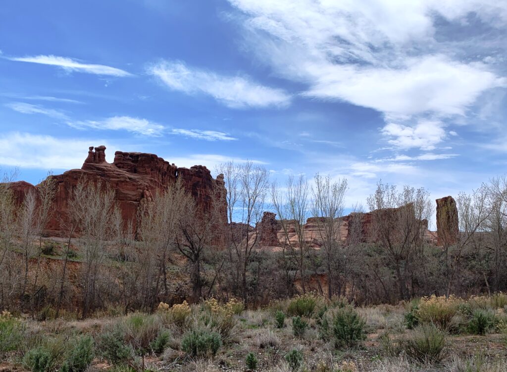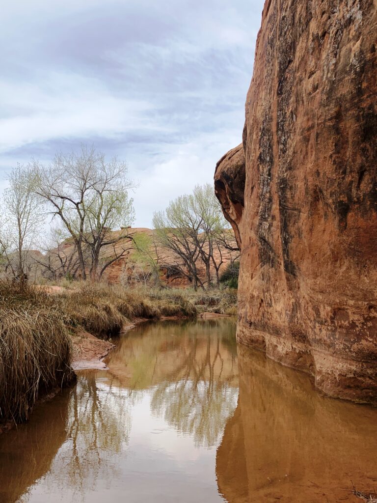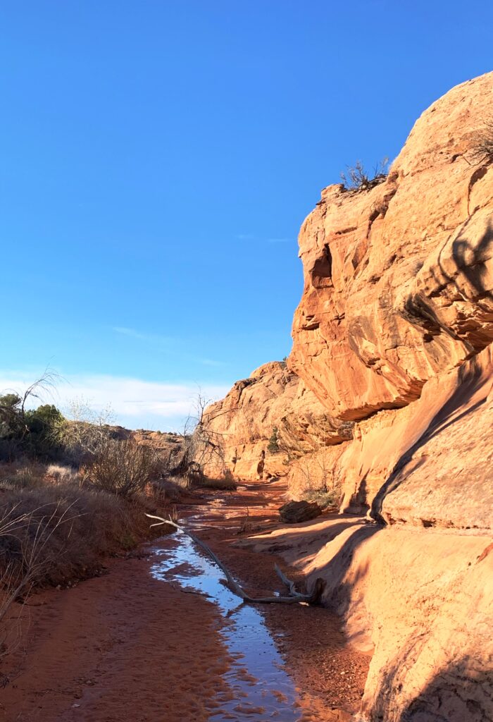 Once I crossed under the Arches road bridge, I entered the Lower Courthouse Wash with mostly narrow, deep channels. I crossed the creek a few times walking across logs but the next one had one skinny log over slow-moving water that was clearly over my head. I decided the best plan was to enter the water and work my way across going hand over hand from under the log. Quite refreshing and sopping wet, I struggled to get up the other side with a full pack.