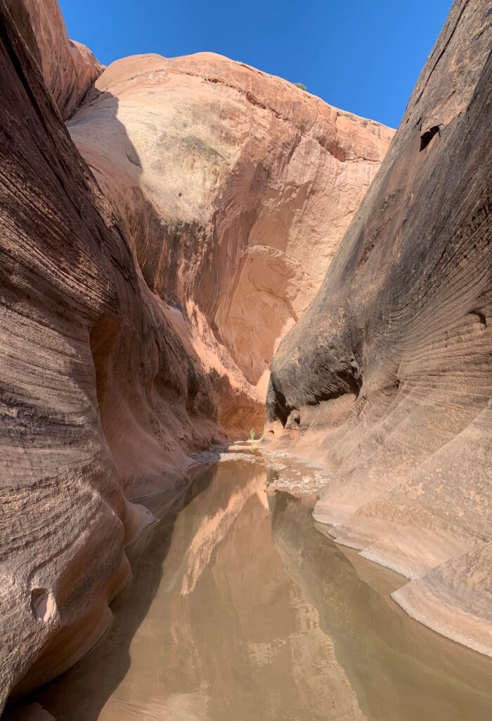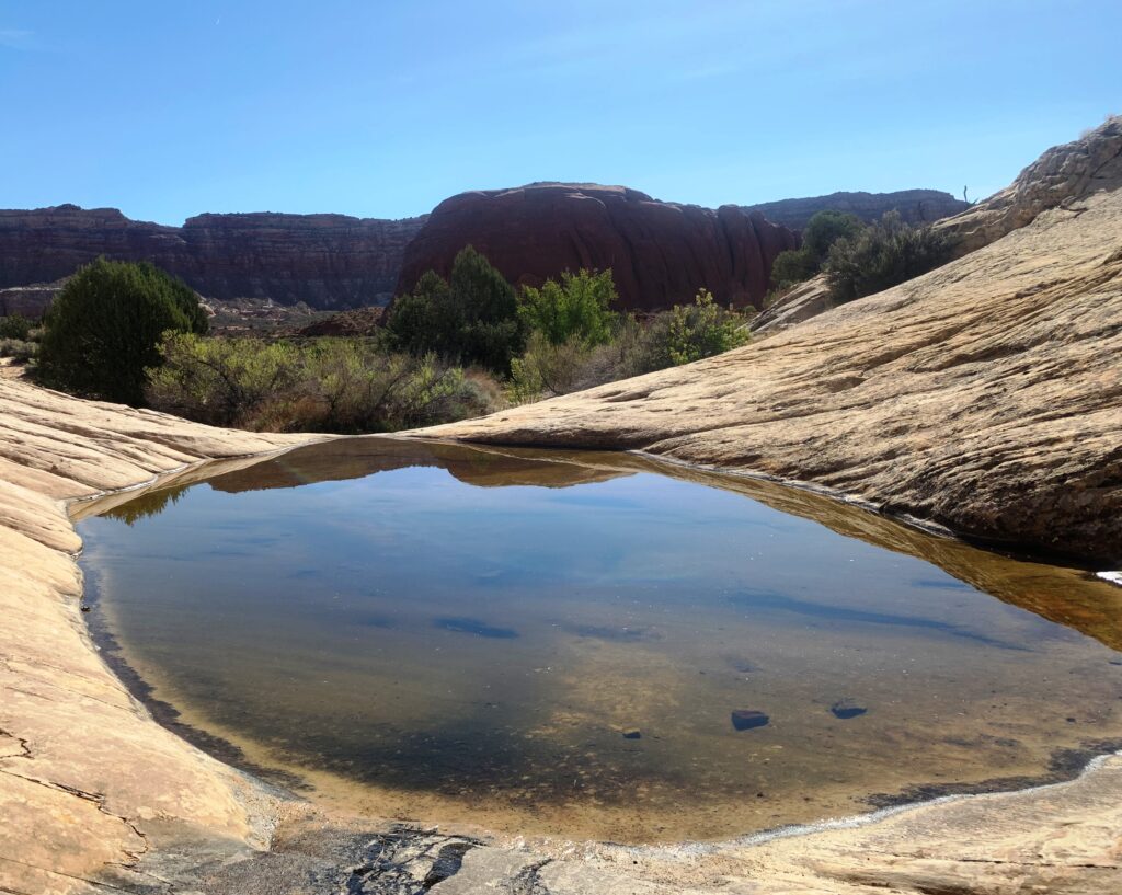 I really enjoyed the rest of my hike down Lower Muley Twist in the shade of the sheer sandstone cliffs. A bit of water in the creek but I didn’t try it. Right at the end of this segment, I did a short detour to Muley Tanks. A couple of large potholes in a pretty setting.