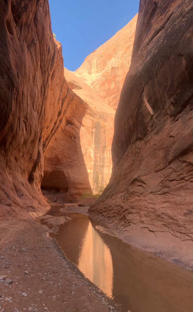 Walking down Halls Creek Narrows, less than four miles long, was spectacular and magical. A twisting slot canyon with different views around every corner. Walking in water most of the way – thigh deep at the most. I was surprised to see so many little fish and the frogs were in full chorus in the early evening. Also saw some bear tracks – who has right of way in a slot canyon?