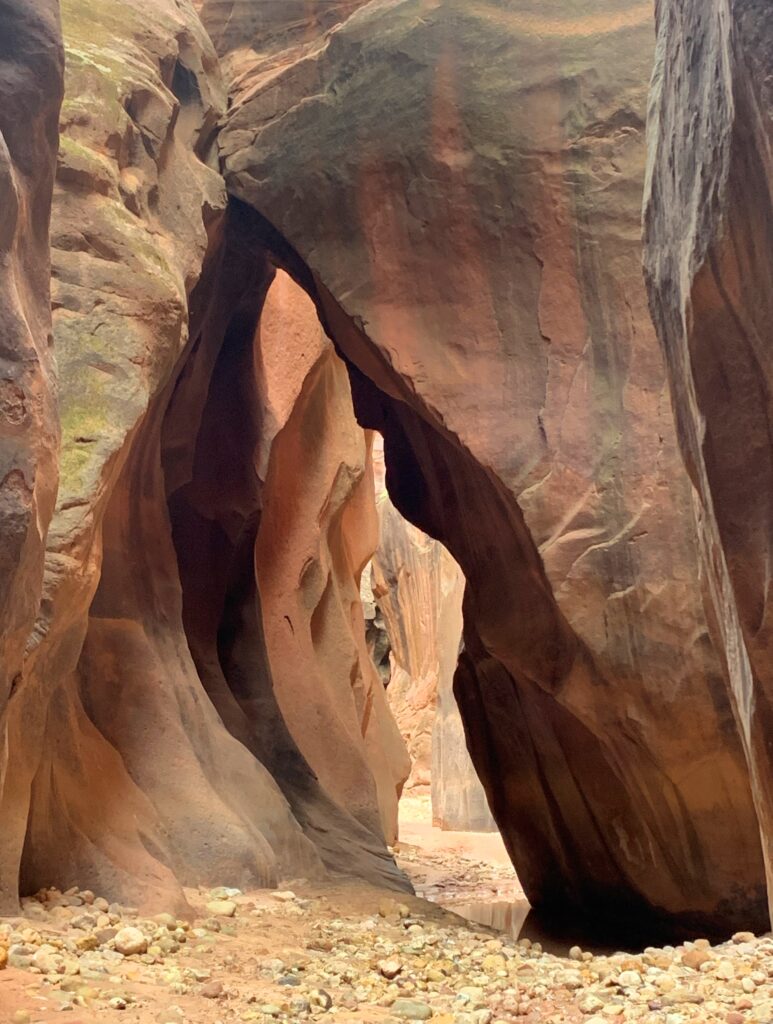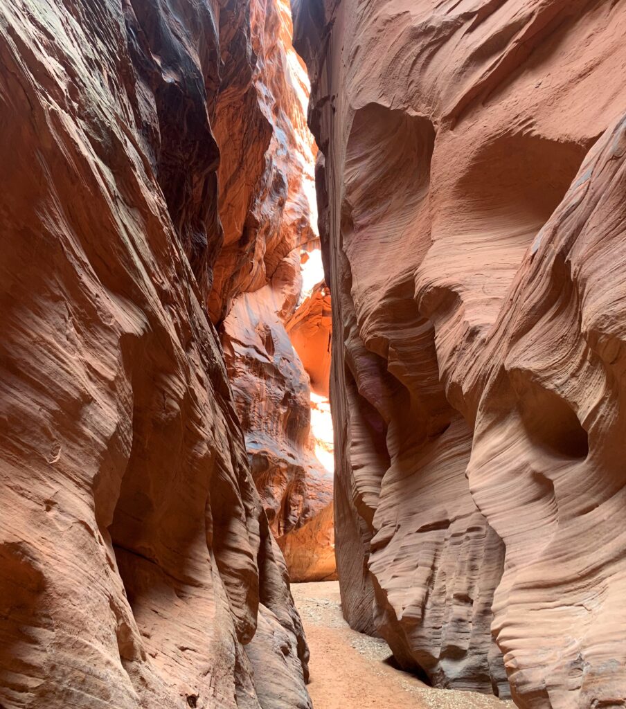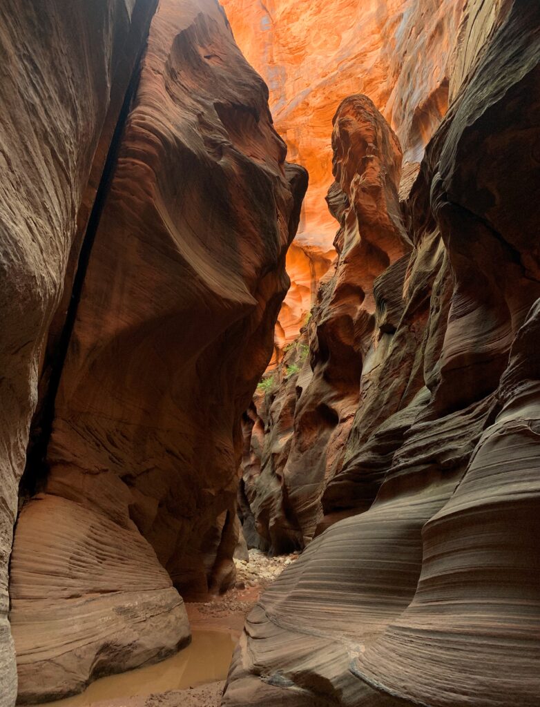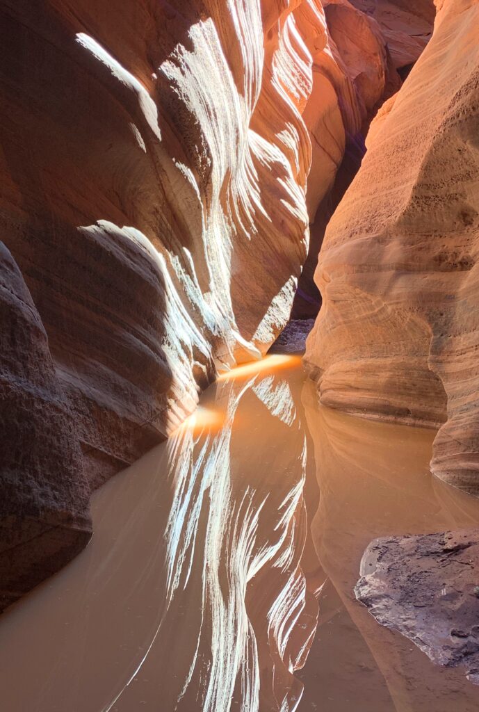 Wow, what a spectacular day! I hiked down Lower Buckskin Gulch for almost 12 miles to where it dumps into Paria Canyon. Much of the Gulch was a narrow slot canyon with varying degrees of light and varying amounts of silty water.